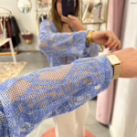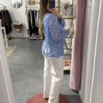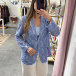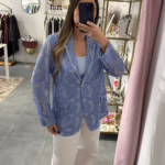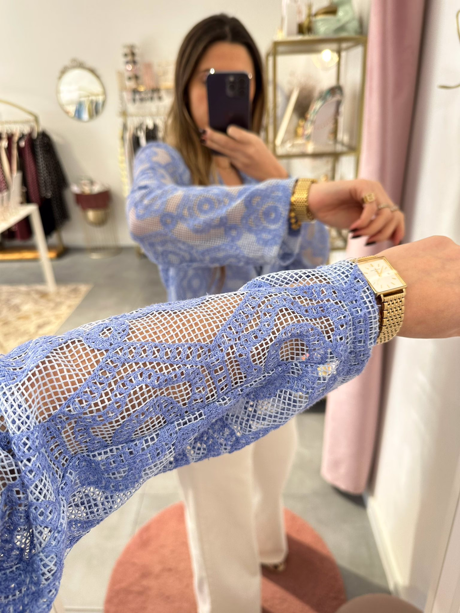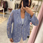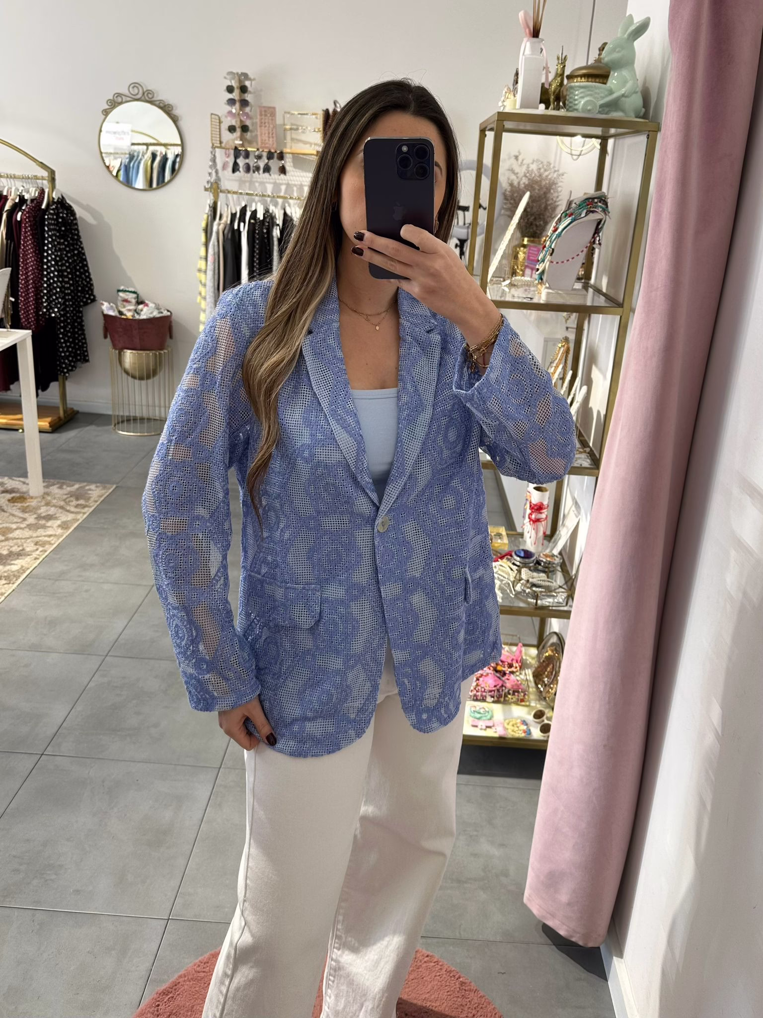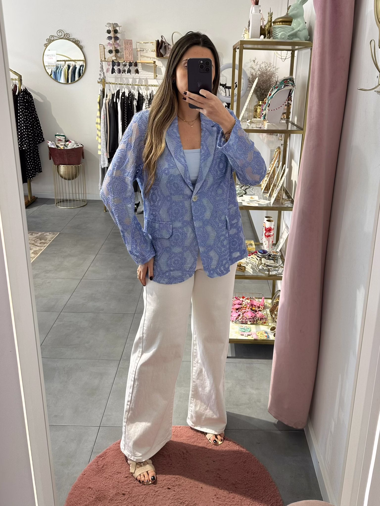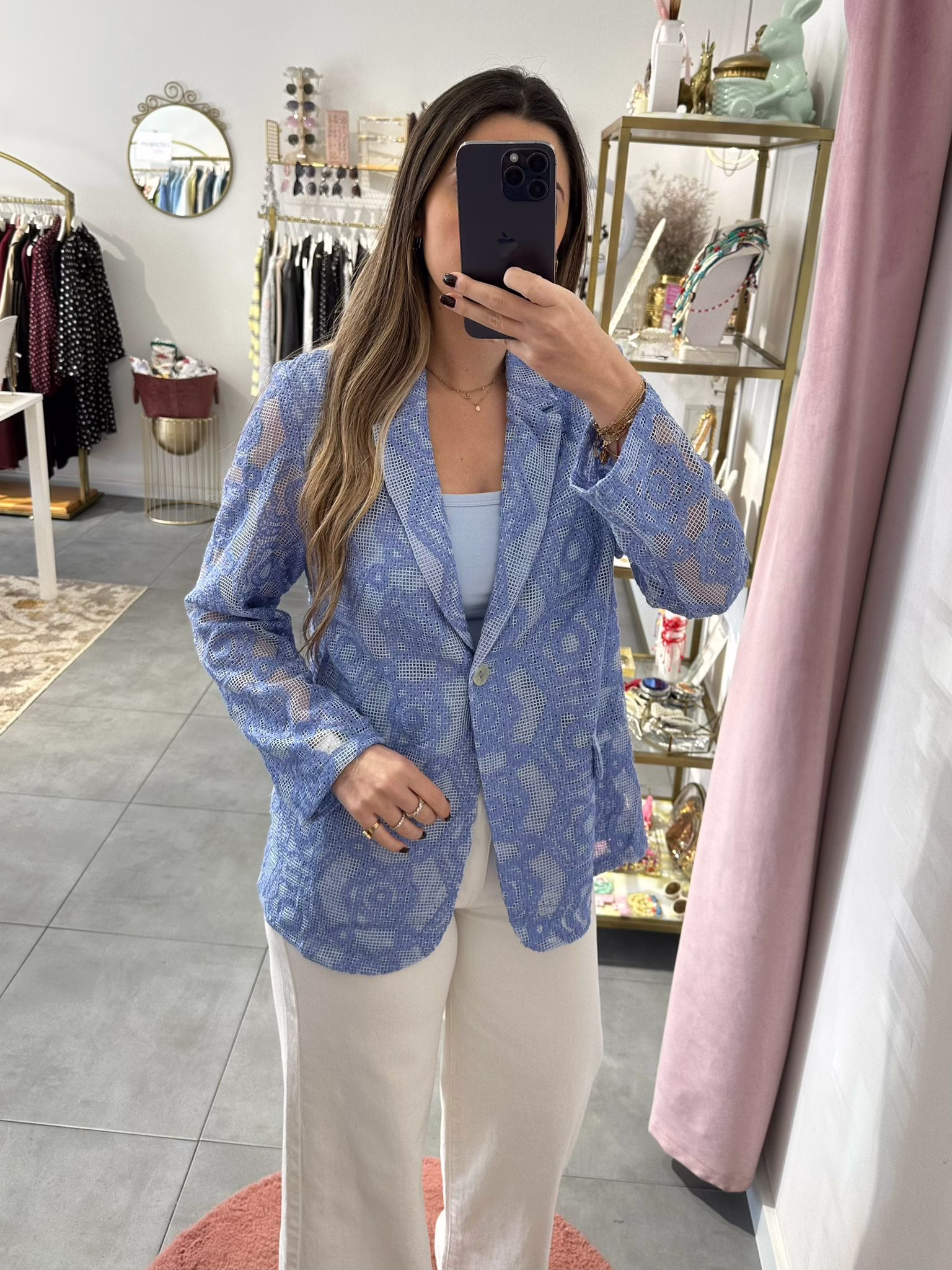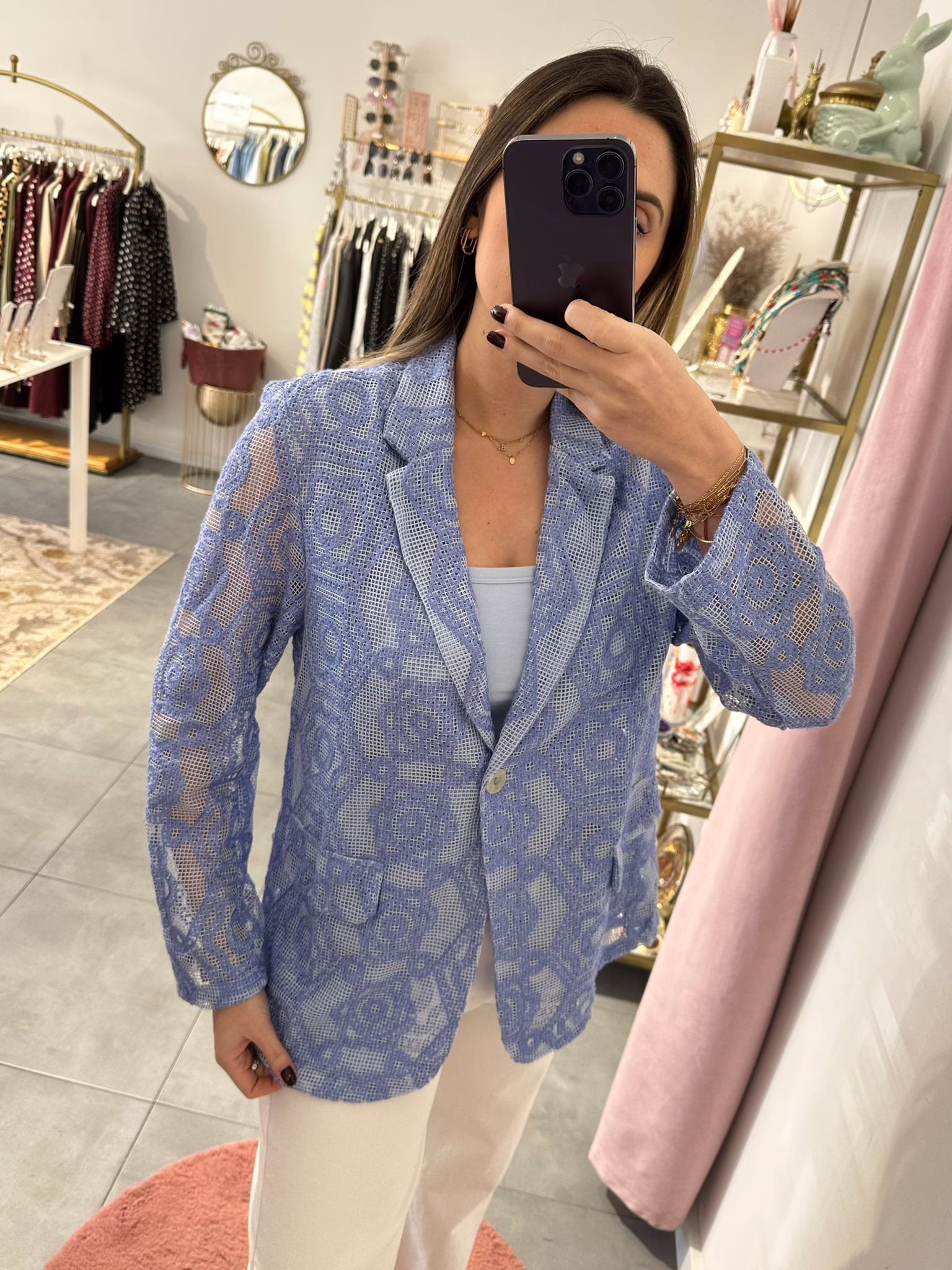Blazer em rede com padrão azul, aperta com botão. Não é forrado.