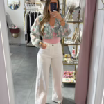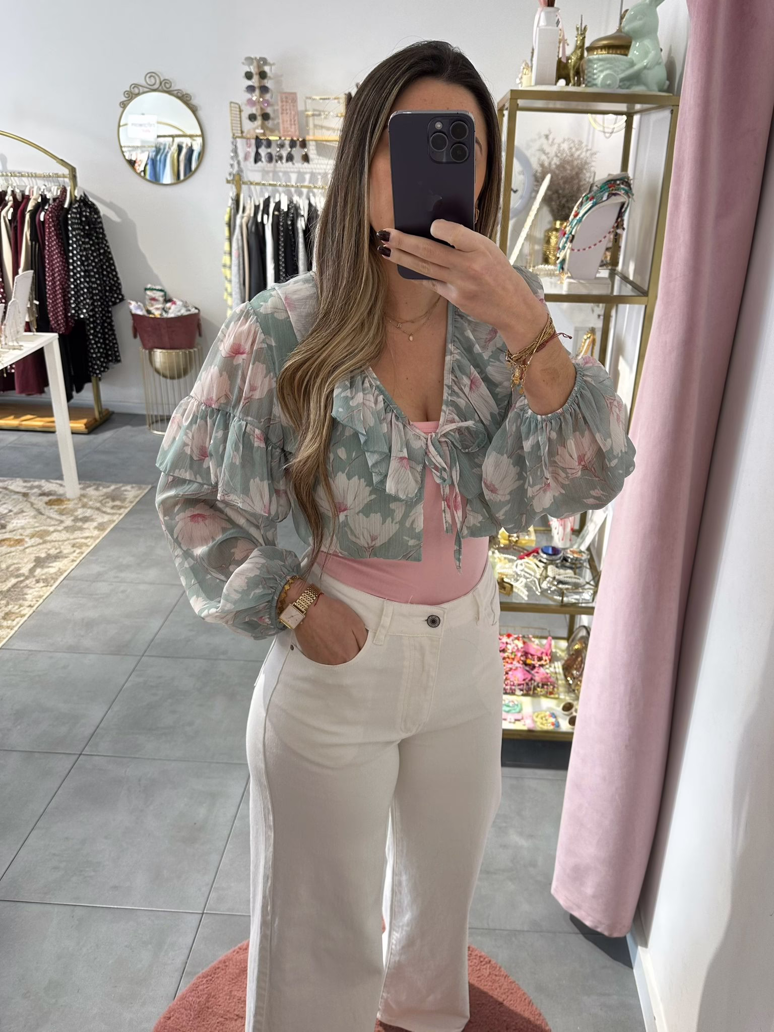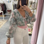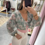Blusa com padrão florido curto, as mangas são abalonadas.