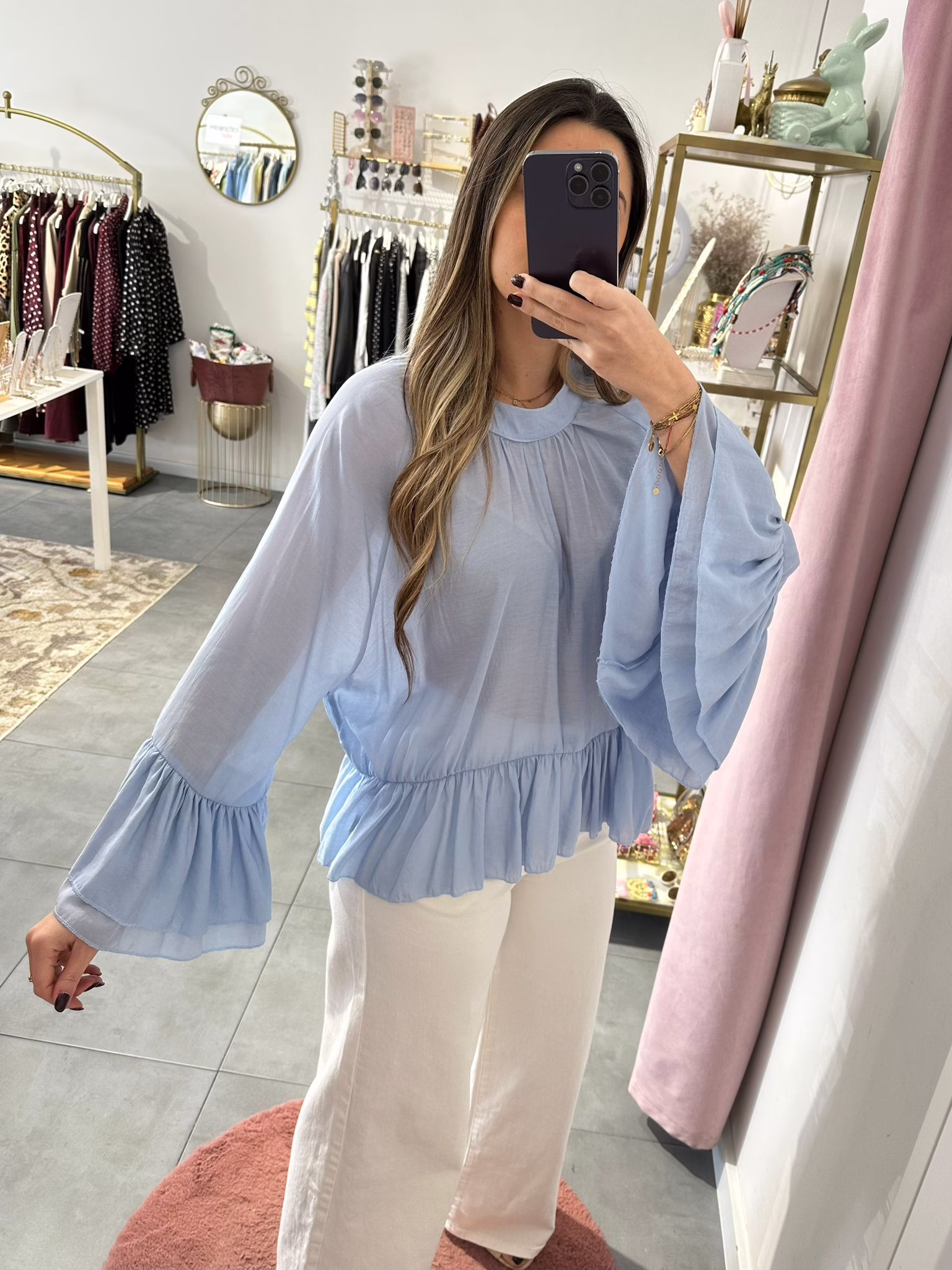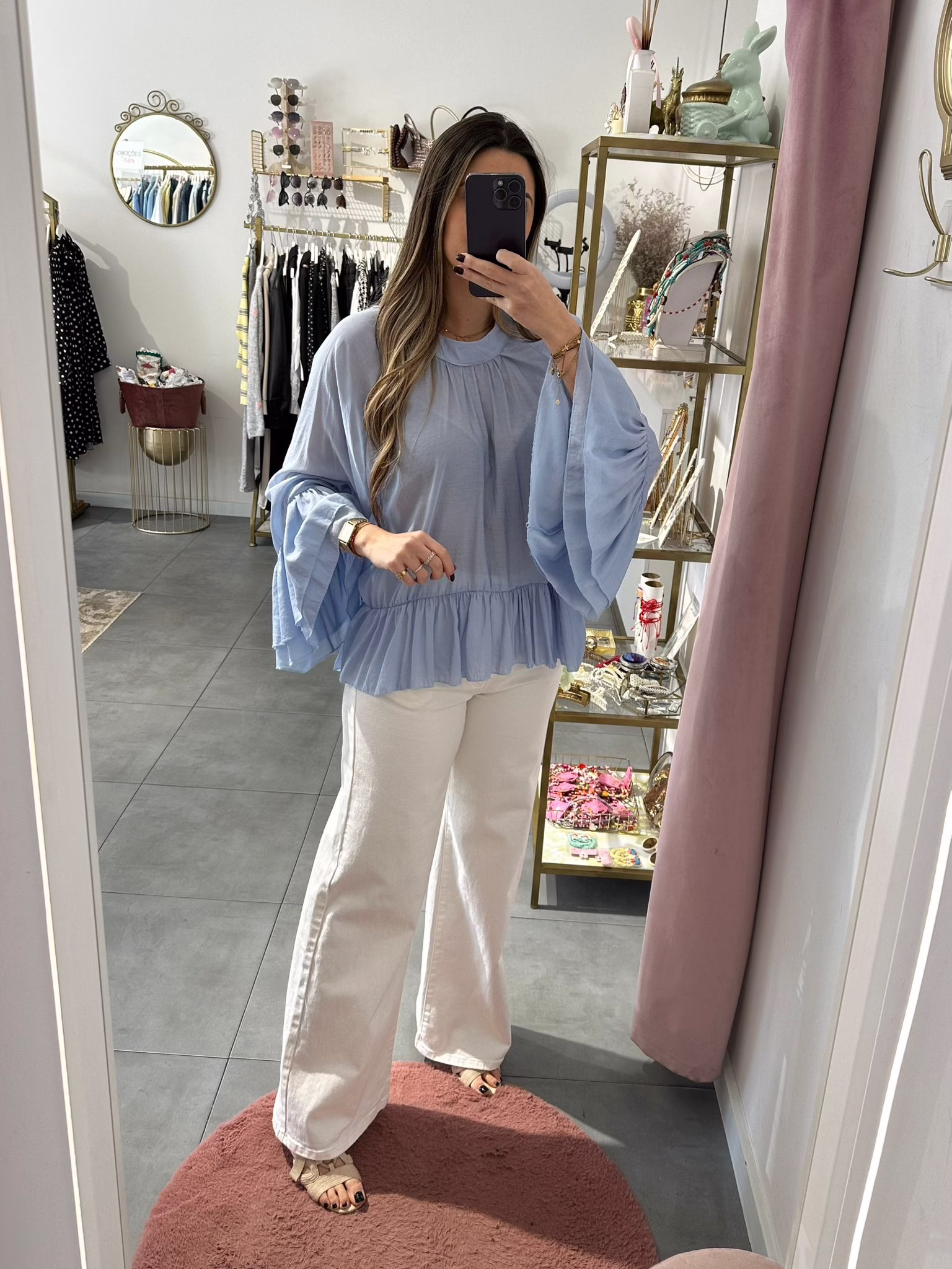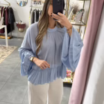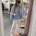 A modelo tem 1,73m e veste o tamanho M/L parte de cima e um 38/40 de parte de baixo.