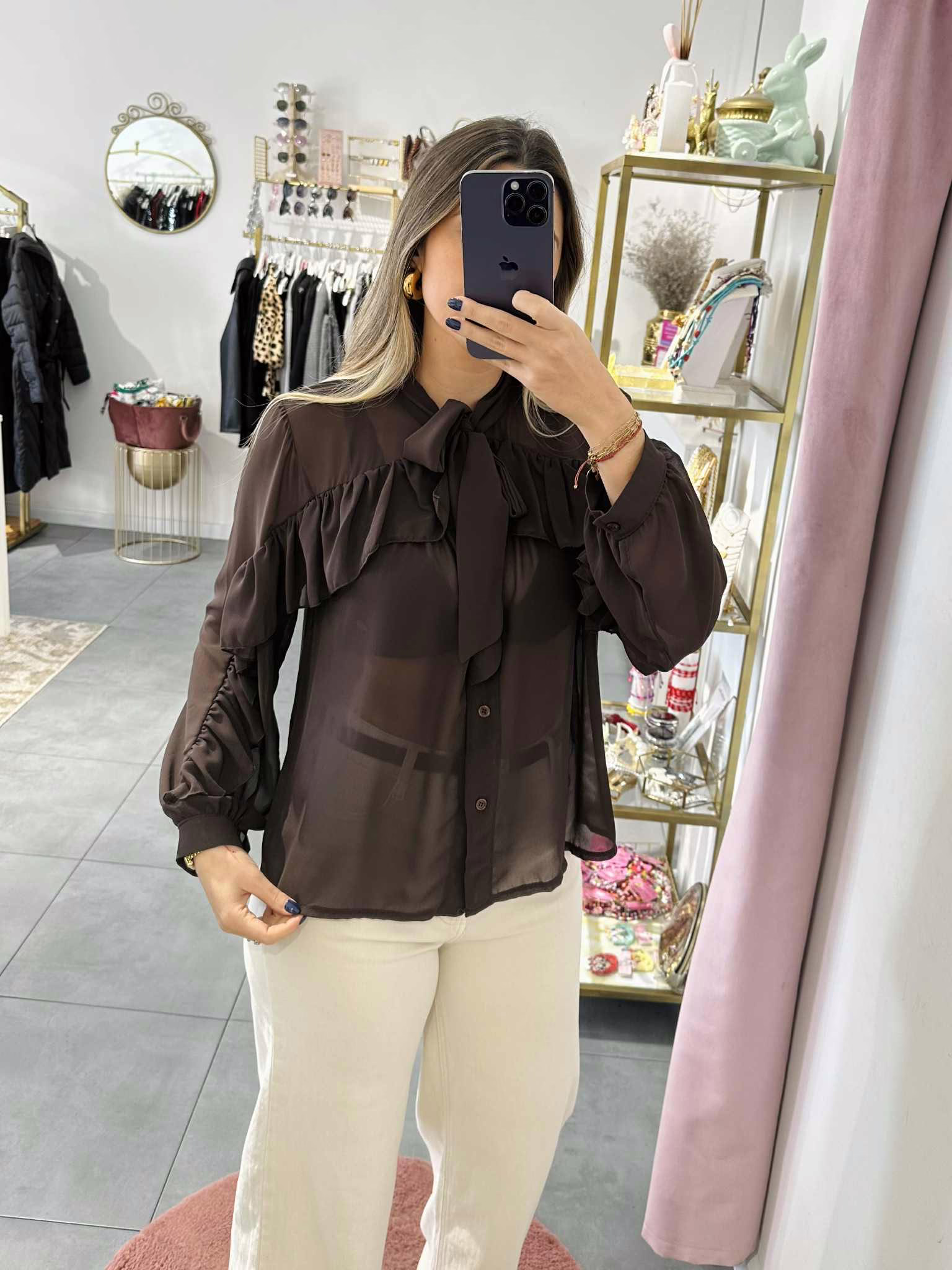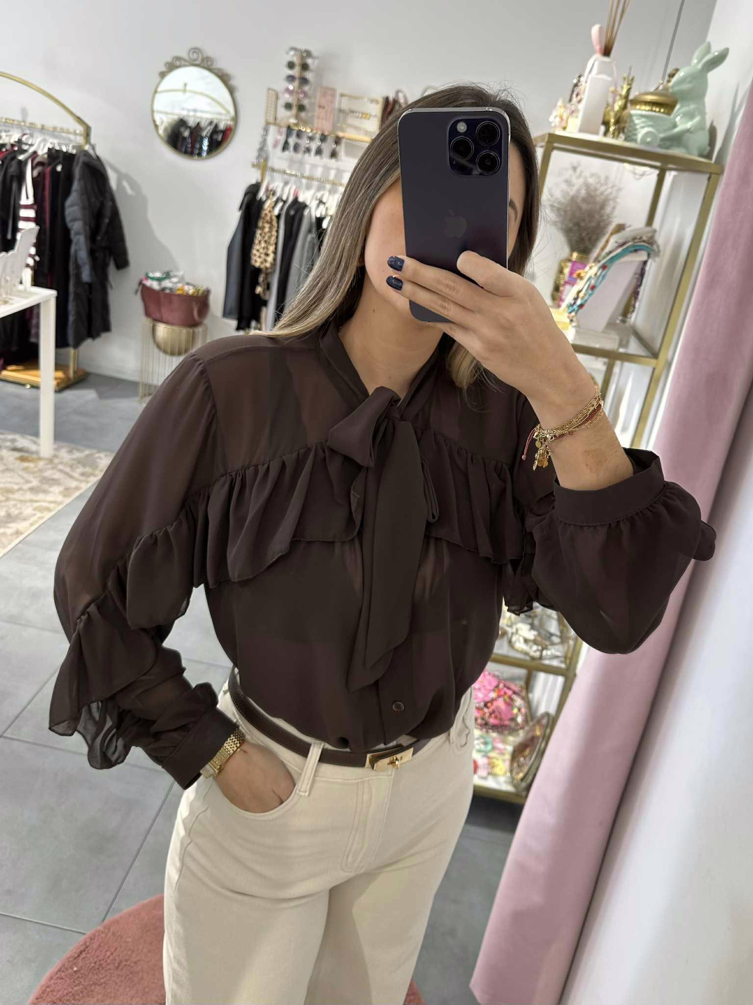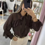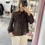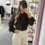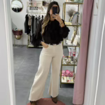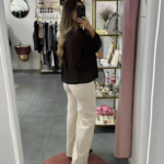 A modelo tem 1,73m e veste o tamanho M/L parte de cima e um 38/40 de parte de baixo.