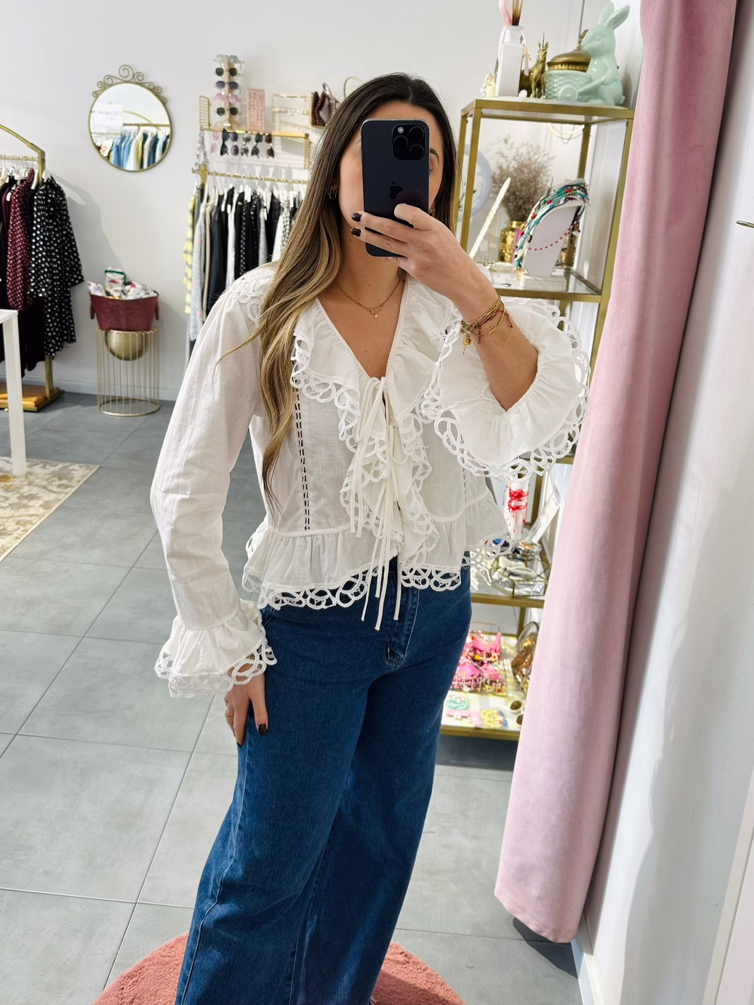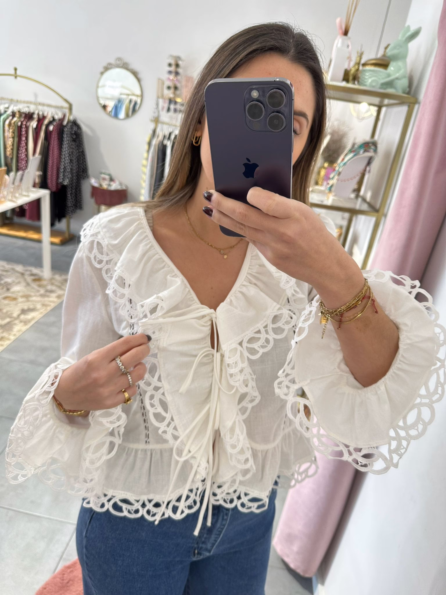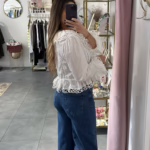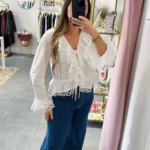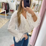 Blusa em algodão com folhos, aperta com botoés e laçadas.