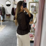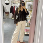 A modelo tem 1,73m e veste o tamanho M/L parte de cima e um 38/40 de parte de baixo.