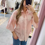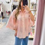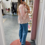 A modelo tem 1,73m e veste o tamanho M/L parte de cima e um 38/40 de parte de baixo.