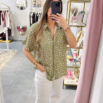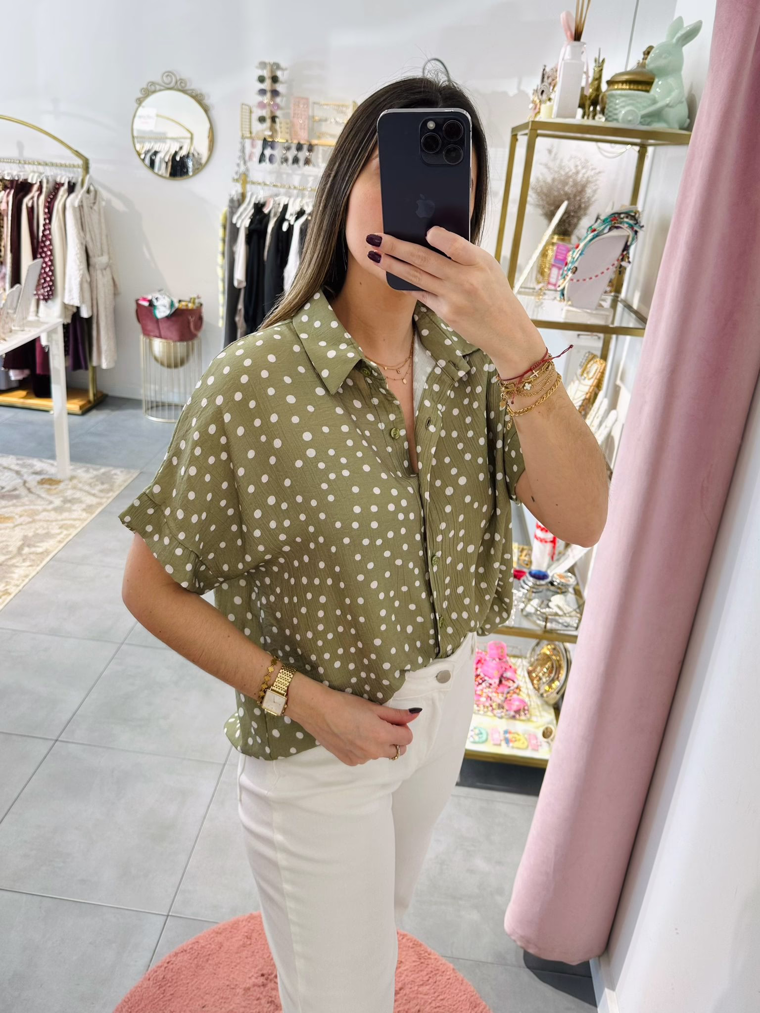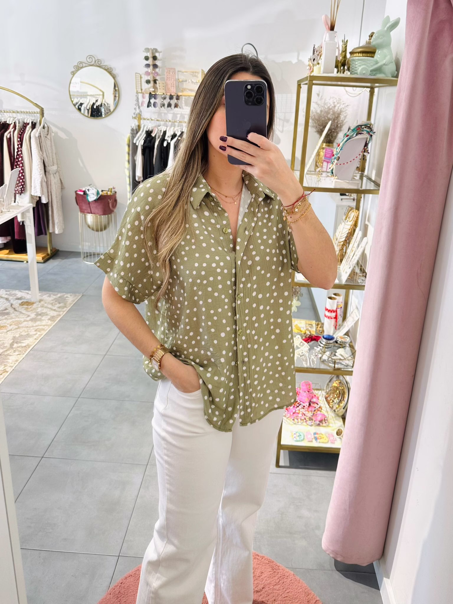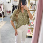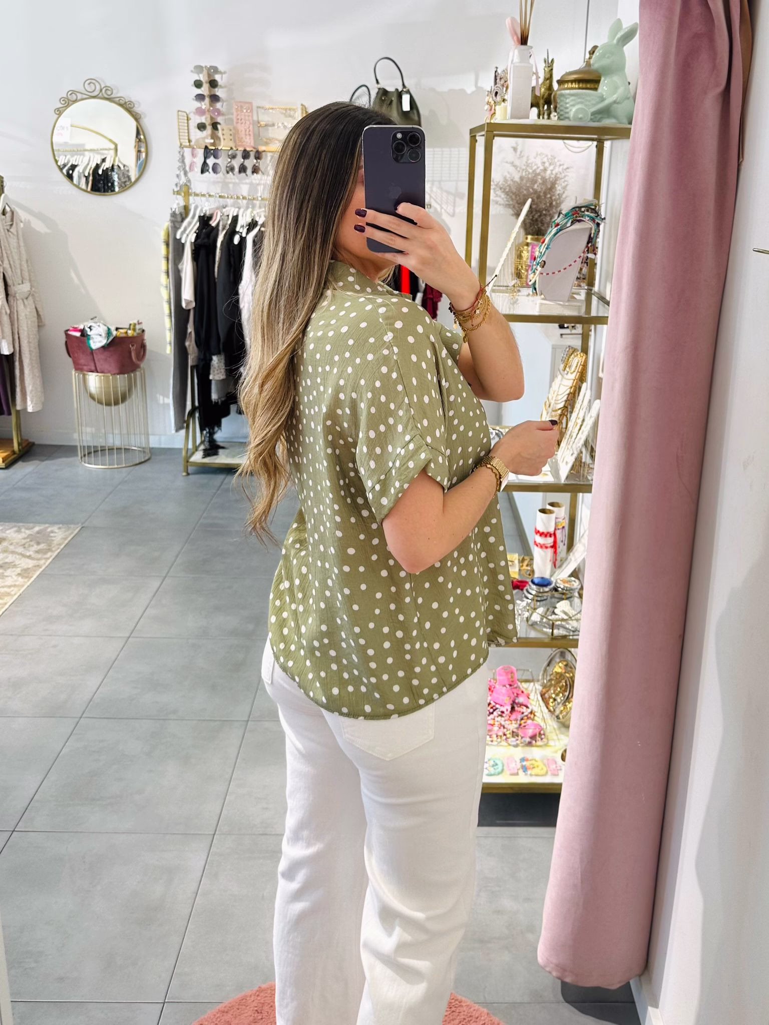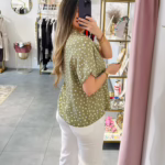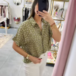 Blusa oversize verde com bolinhas brancas.