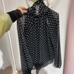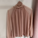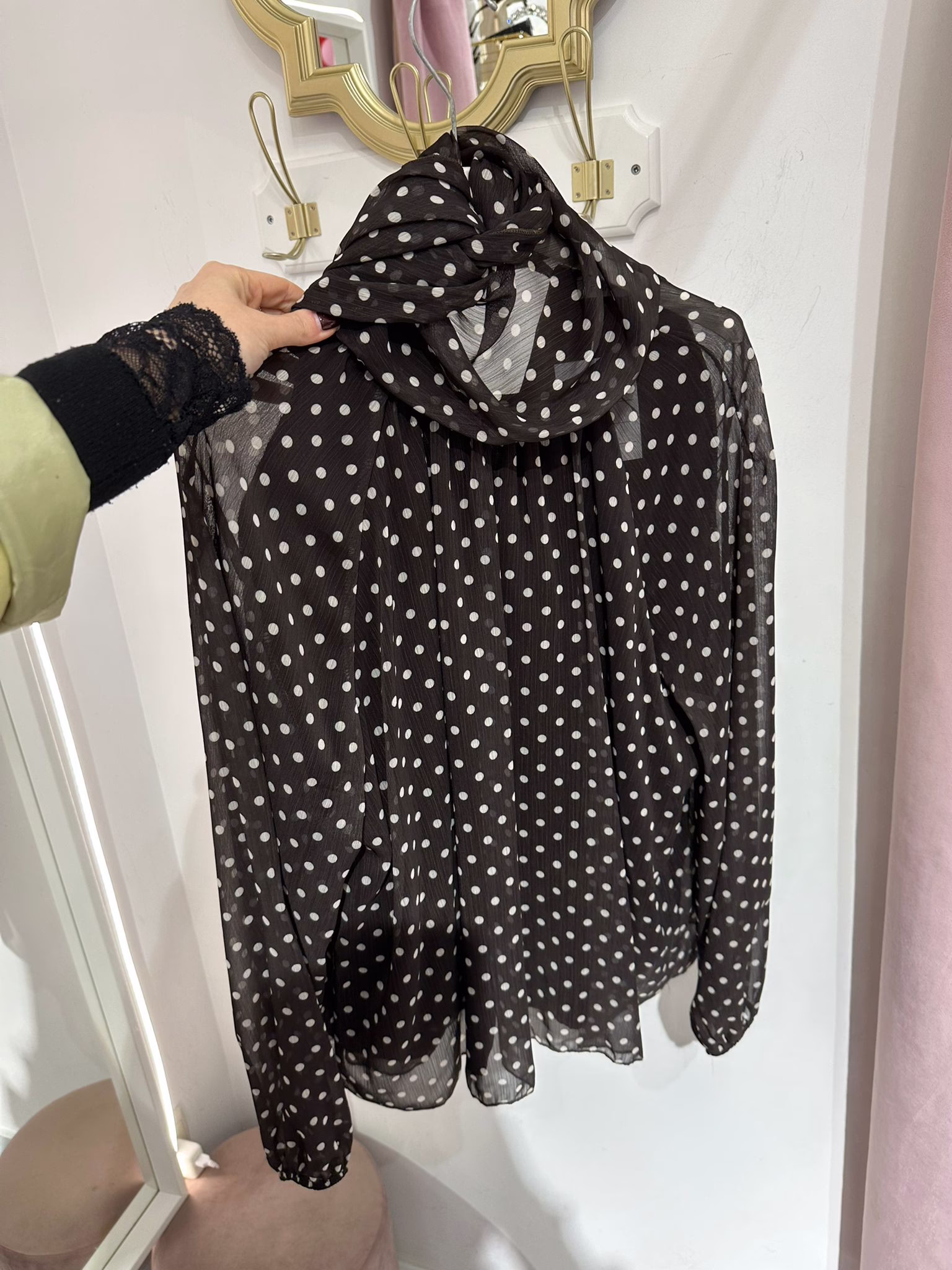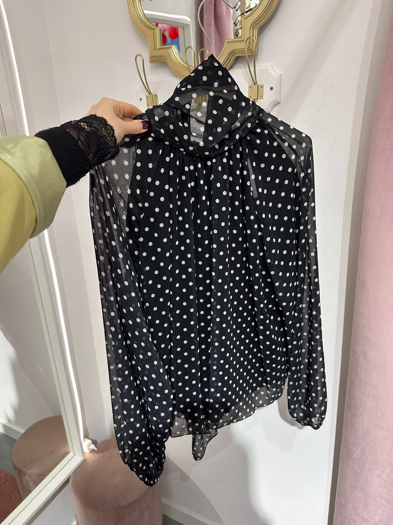 Blusa com laçada na zona do pescoço, é forrada no corpo.