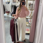 A modelo tem 1,73m e veste o tamanho M/L parte de cima e um 38/40 de parte de baixo.