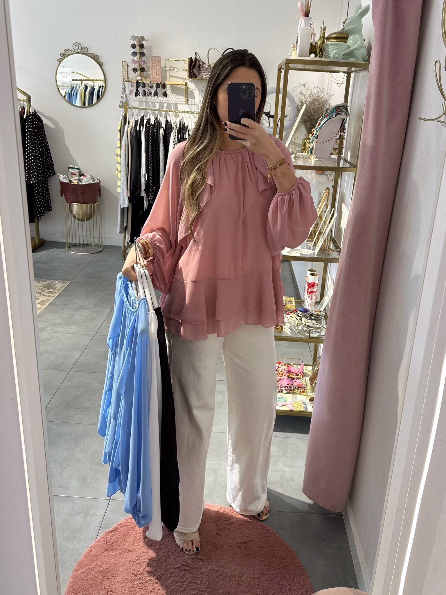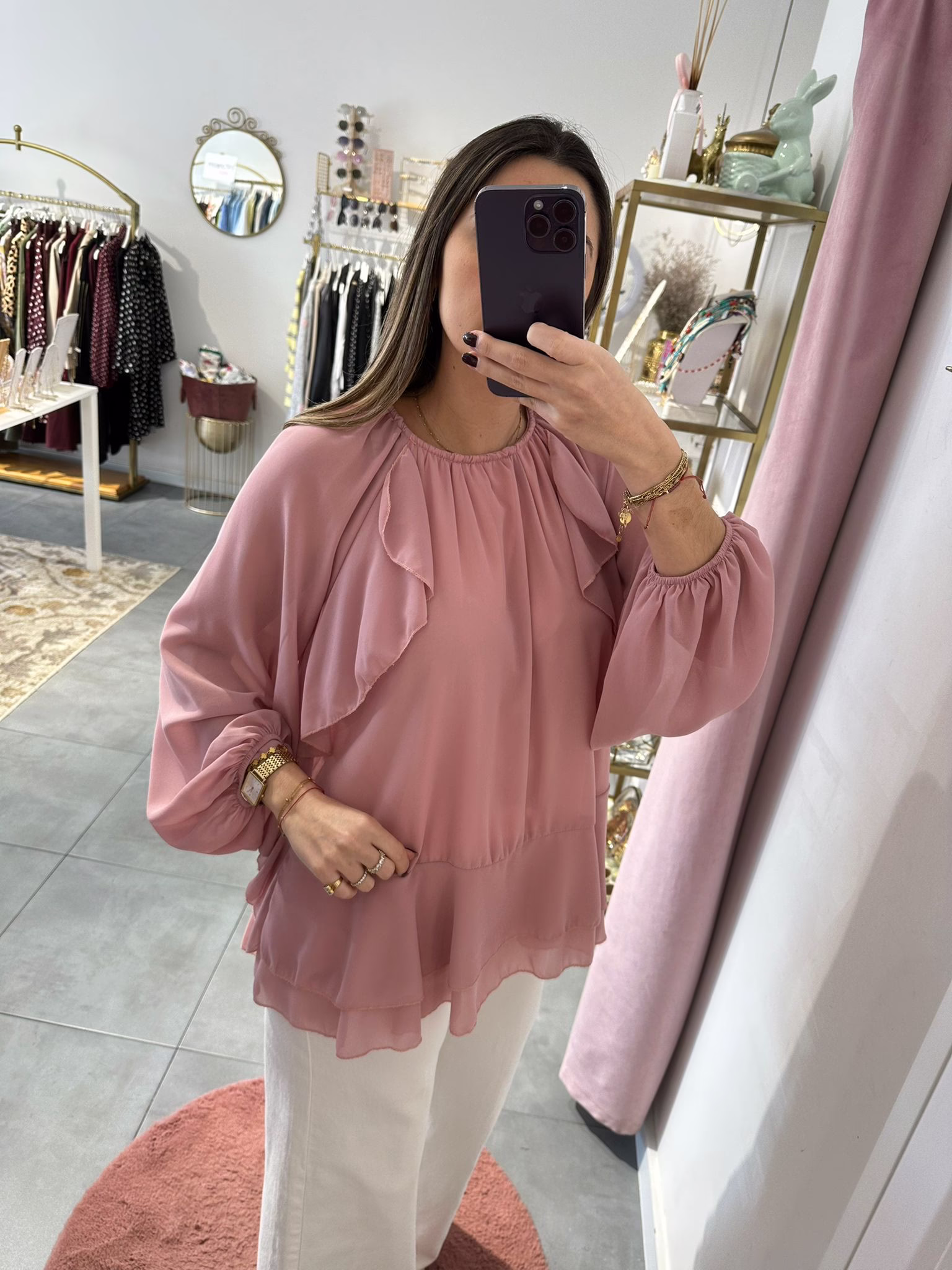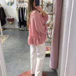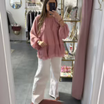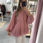 Blusas oversize com folhos, é forrada na zona do corpo, as mangas são abalonadas e tem elástico no punho.