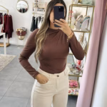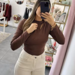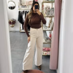 A modelo tem 1,73m e veste o tamanho M/L parte de cima e um 38/40 de parte de baixo.