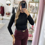 A modelo tem 1,73m e veste o tamanho M/L parte de cima e um 38/40 de parte de baixo.