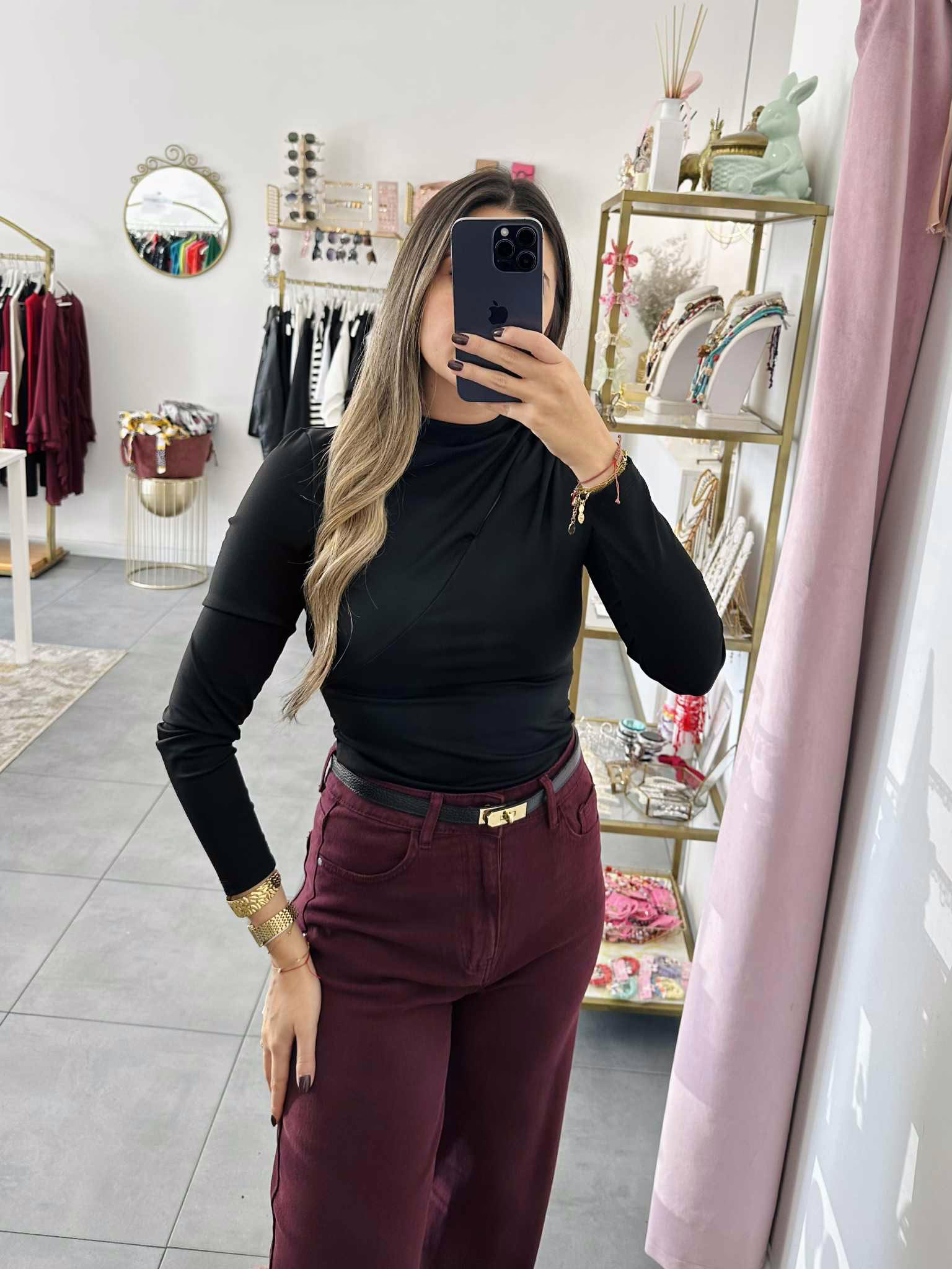 Body em malha de lycra com drapeado e abertura na zona do peito, aperta com molas.