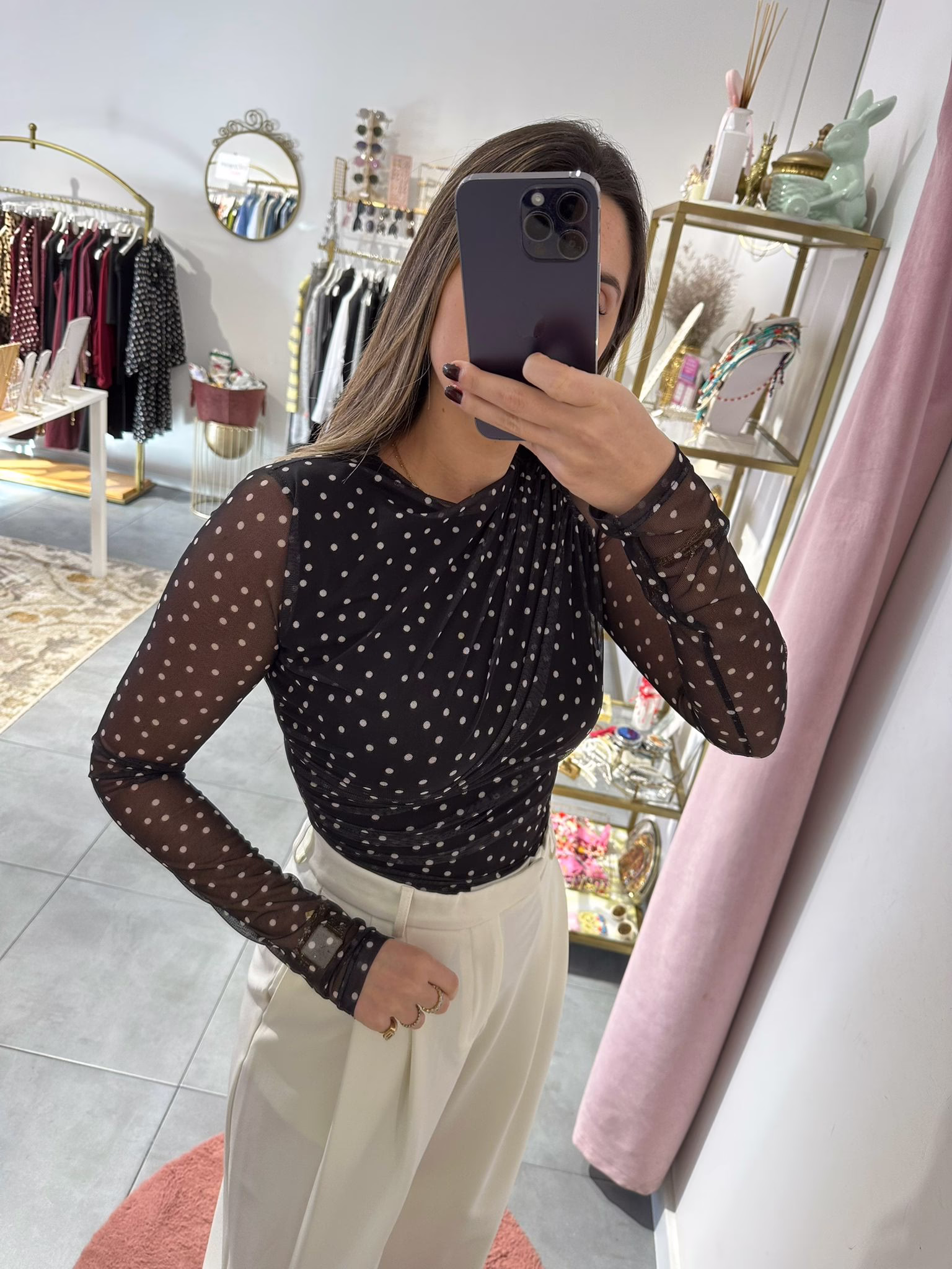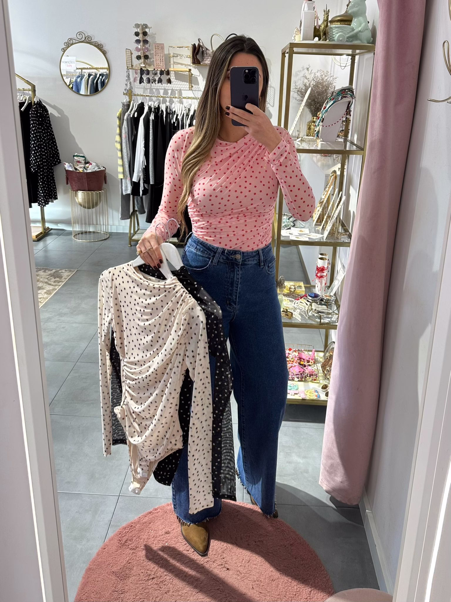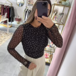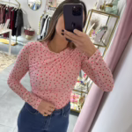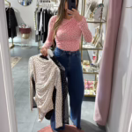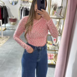 A modelo tem 1,73m e veste o tamanho M/L parte de cima e um 38/40 de parte de baixo.