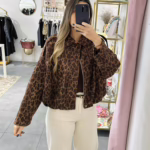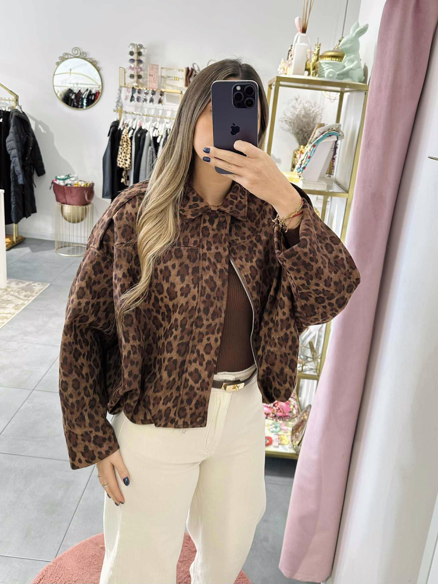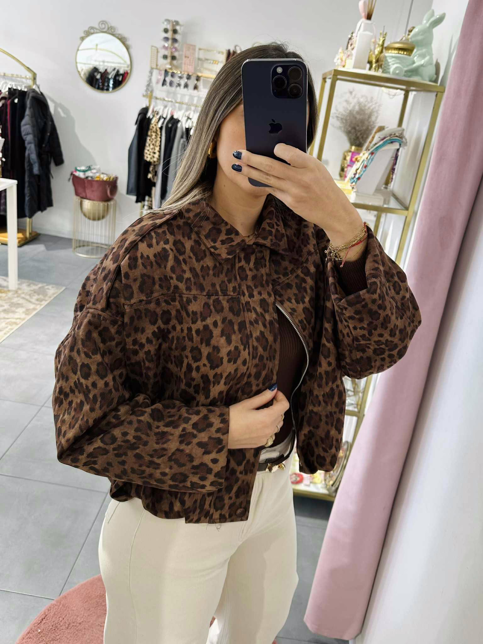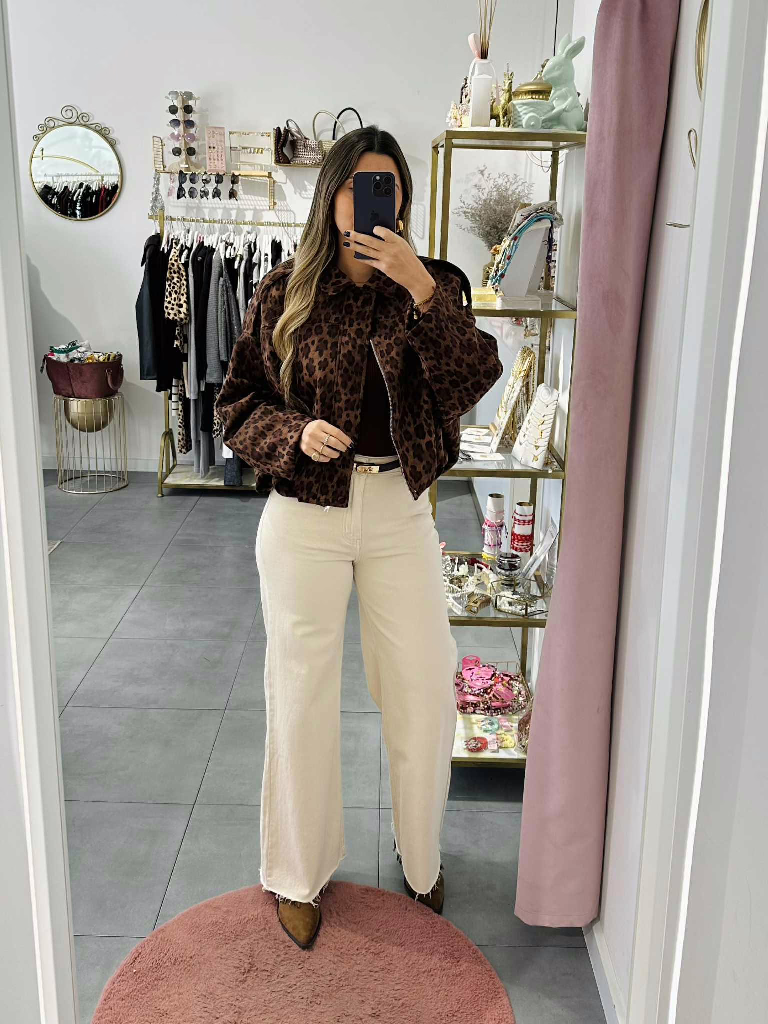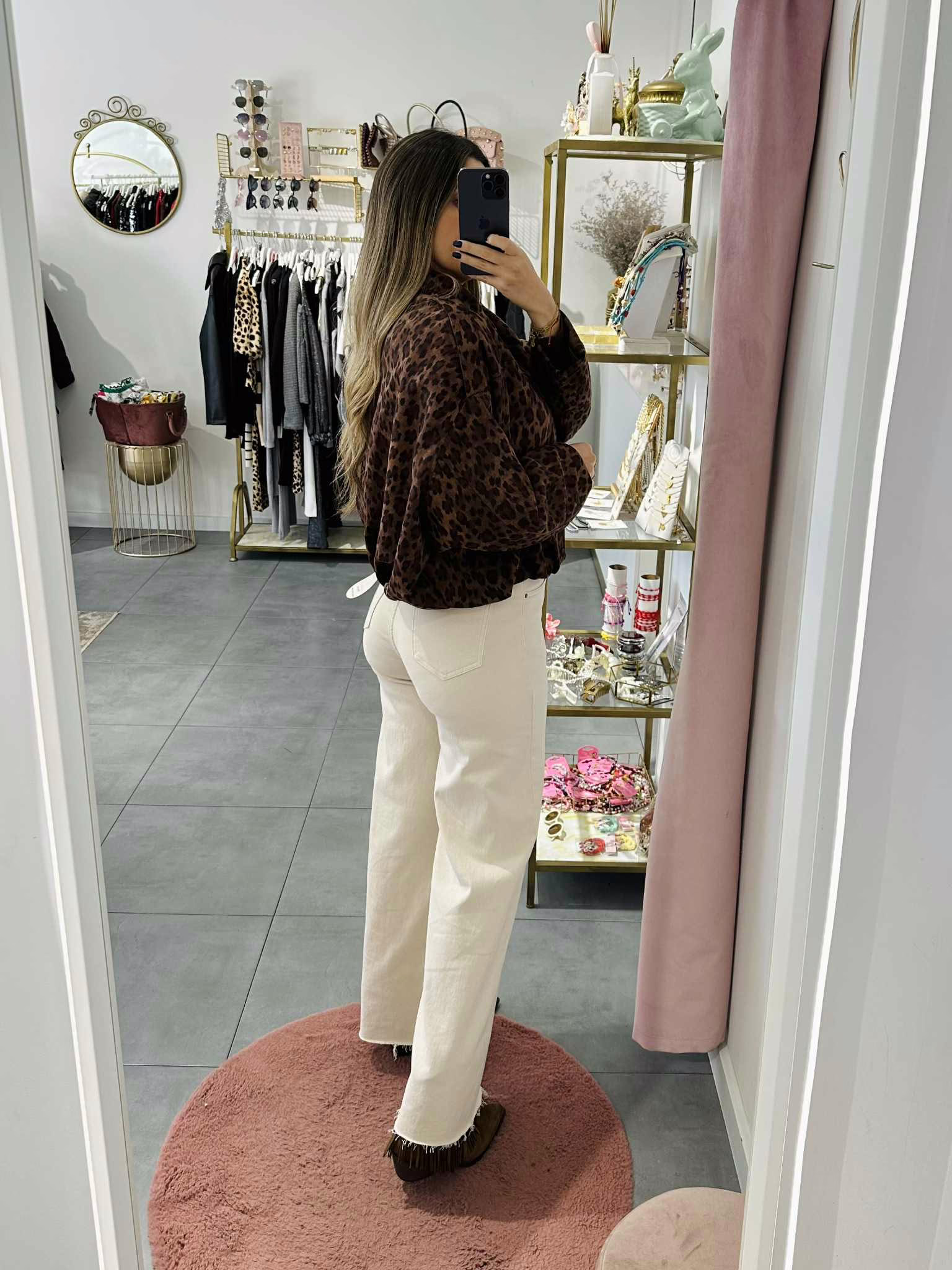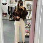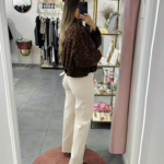 A modelo tem 1,73m e veste o tamanho M/L parte de cima e um 38/40 de parte de baixo.