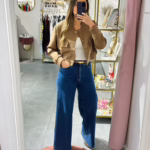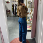 A modelo tem 1,73m e veste o tamanho M/L parte de cima e um 38/40 de parte de baixo.