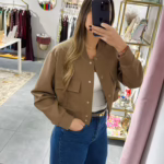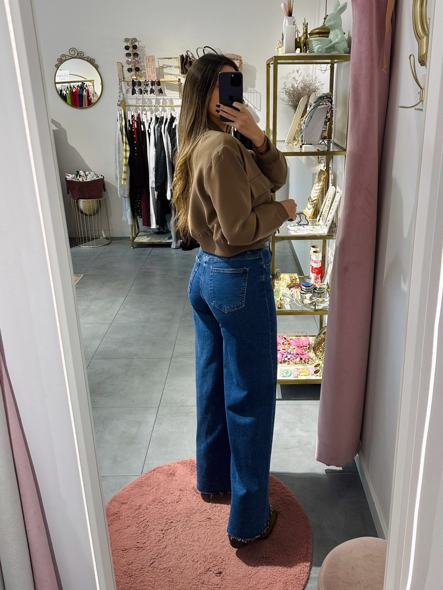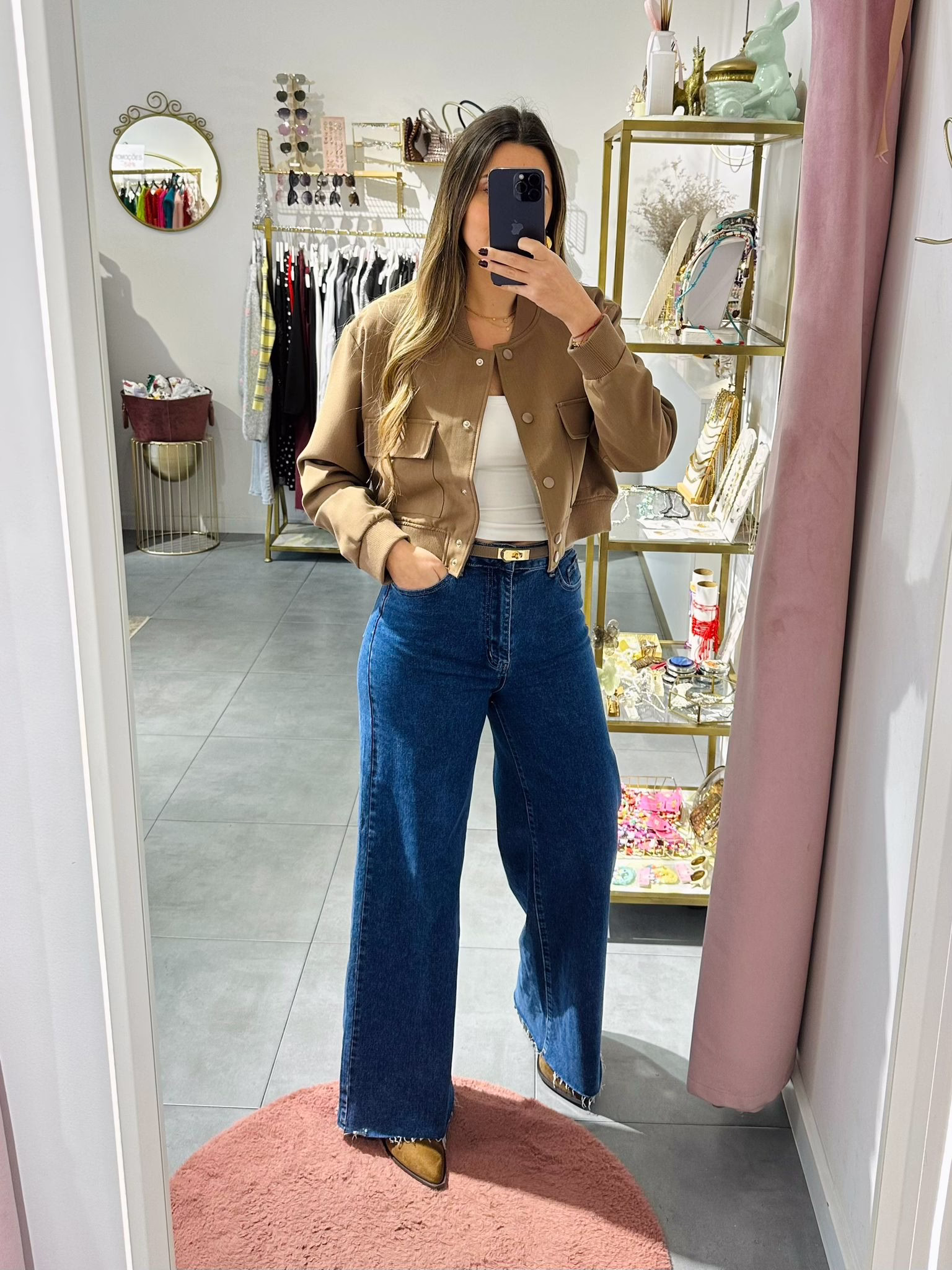 Bomber em tecido, é forrado e tem elástico na cintura. Tem bolsos.