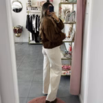 A modelo tem 1,73m e veste o tamanho M/L parte de cima e um 38/40 de parte de baixo.