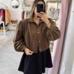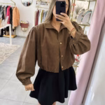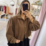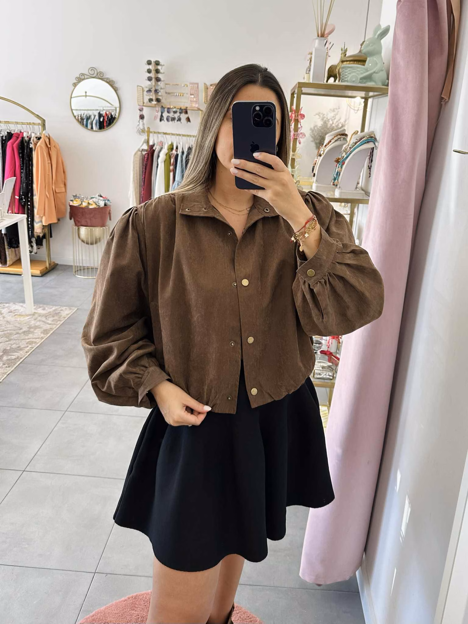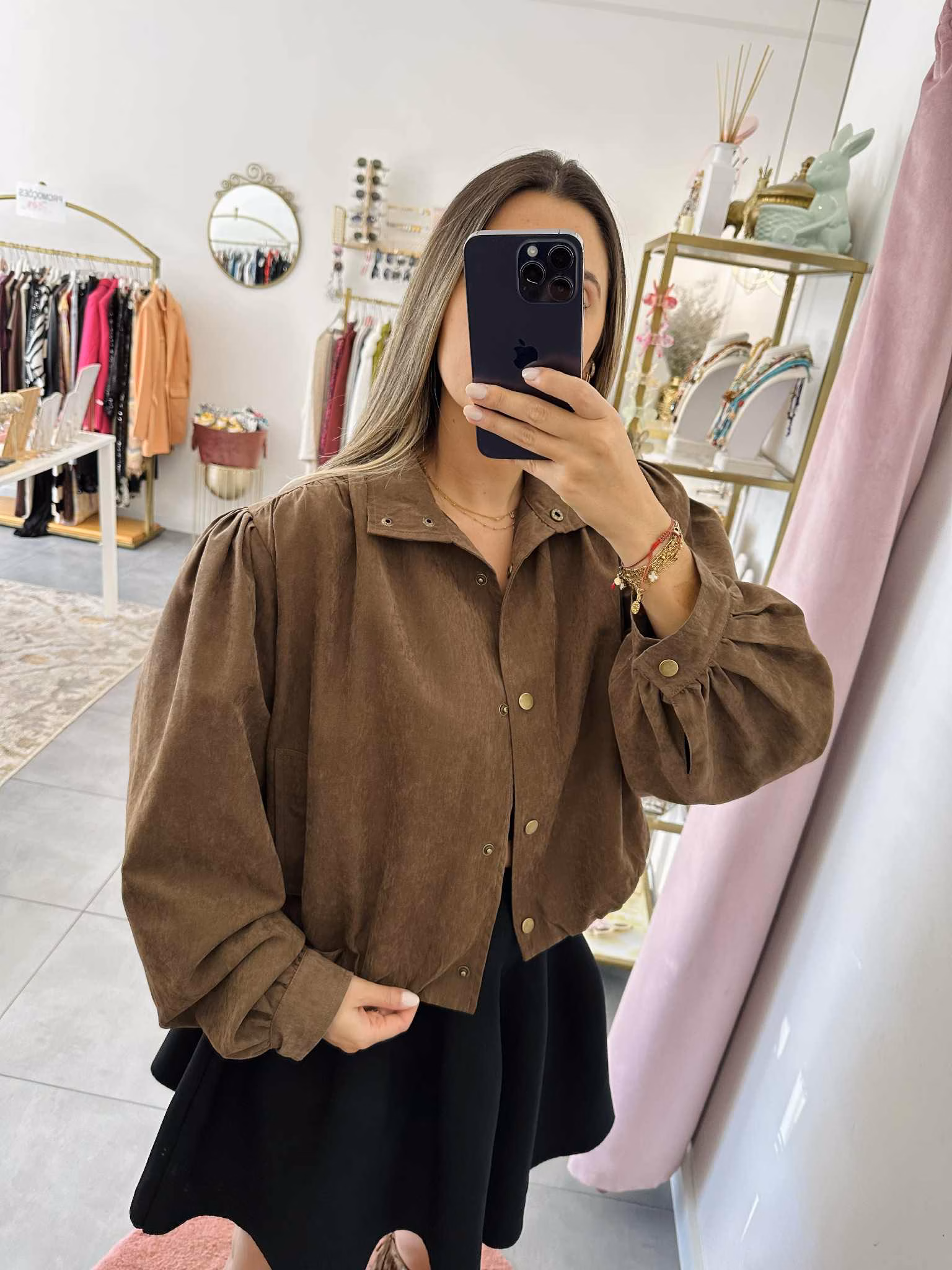 Bomber em castanho com botões dourados, tem bolsos e mangas abalonadas.