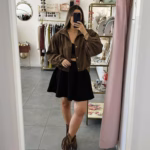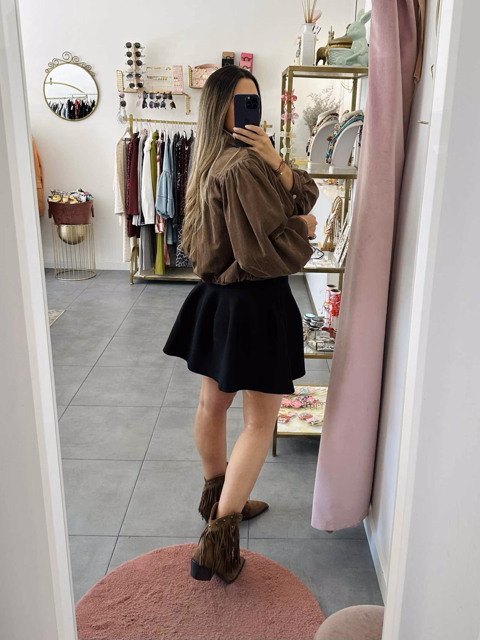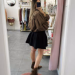 A modelo tem 1,73m e veste o tamanho M/L parte de cima e um 38/40 de parte de baixo.