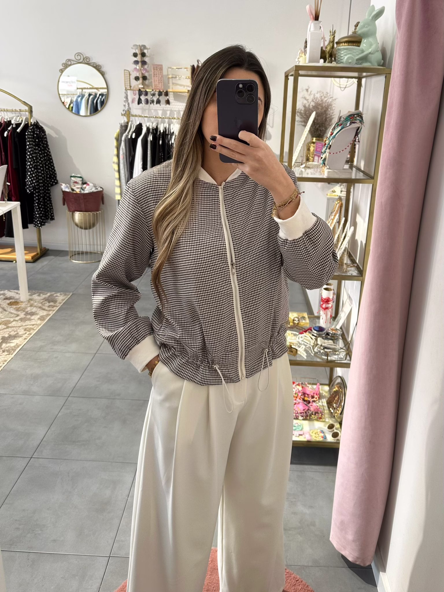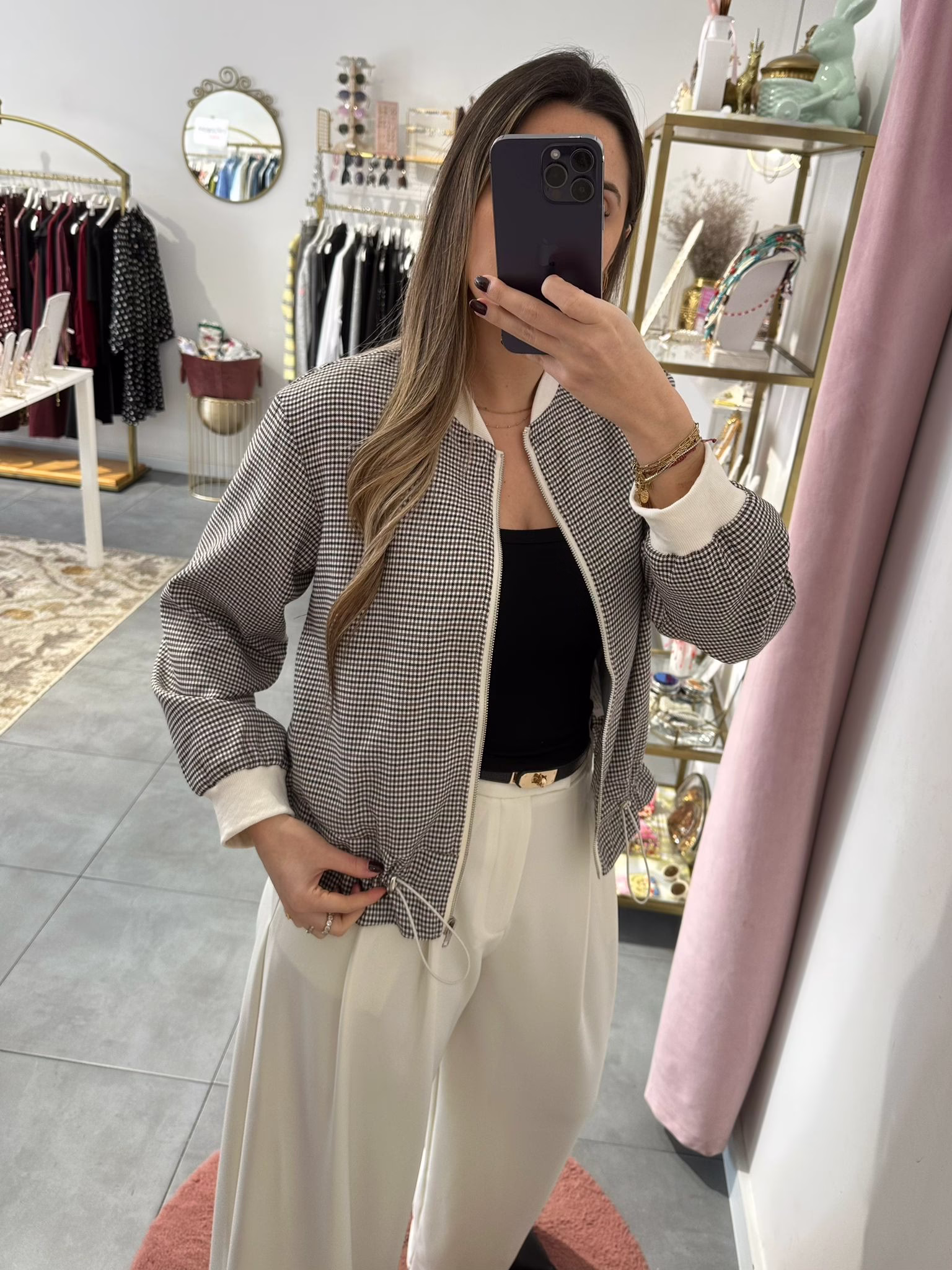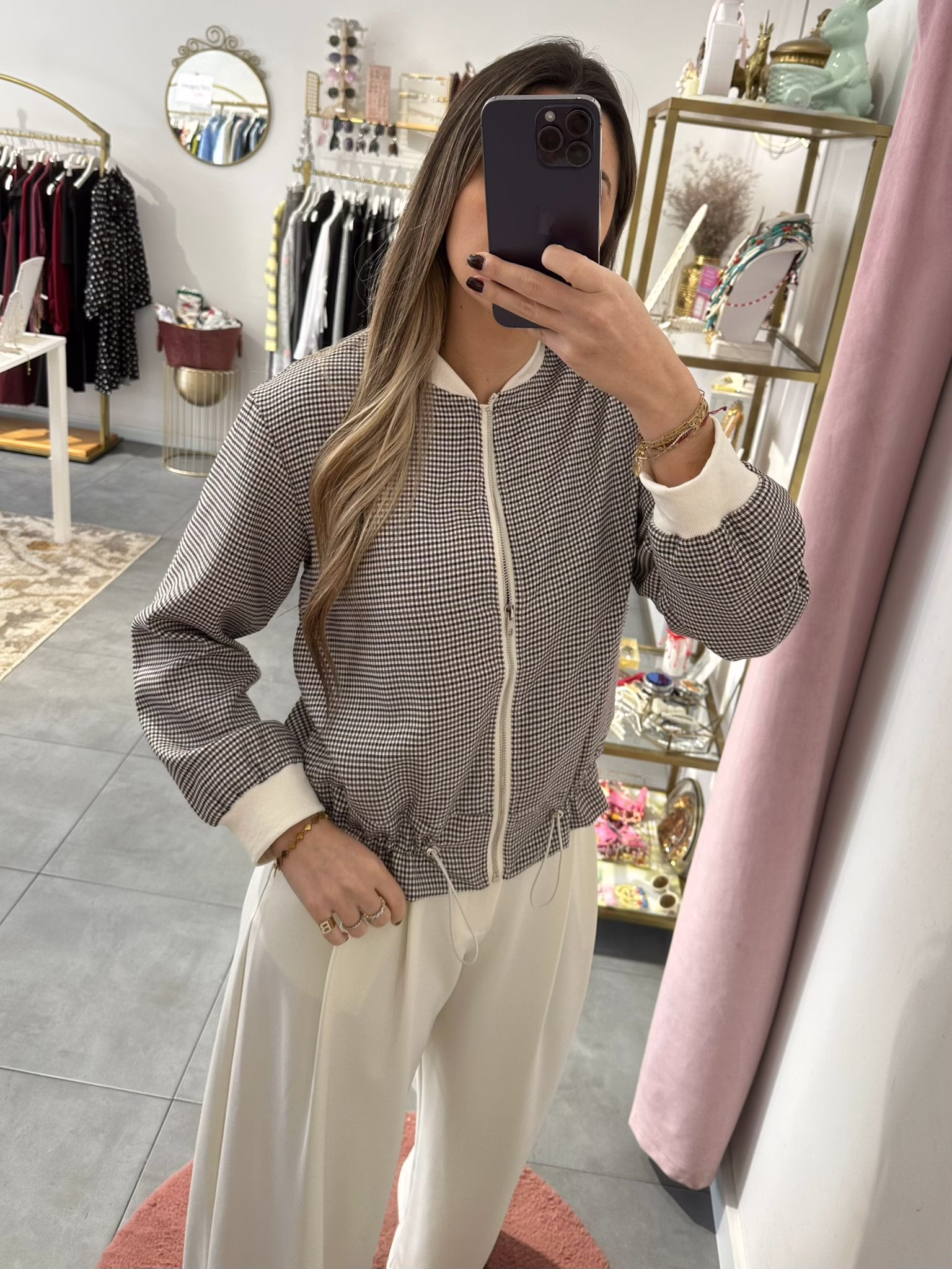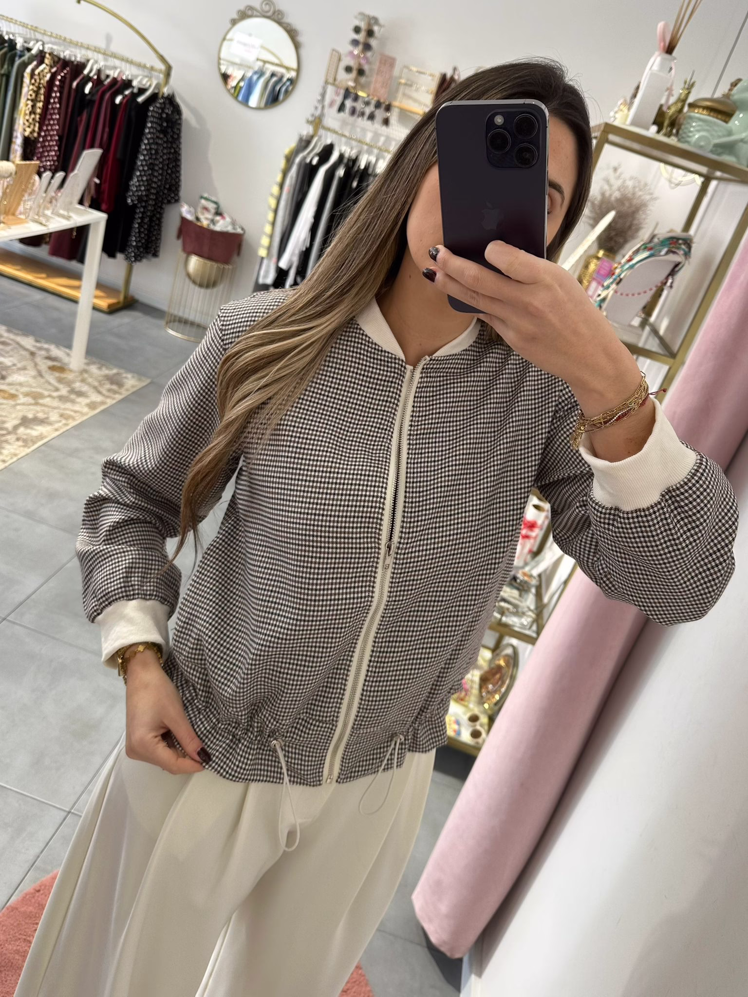 Bomber em tecido xadrez castanho, bege e preto. É ajustável na zona da cintura, tem bolsos e paerta com fecho. É forrado.