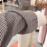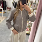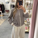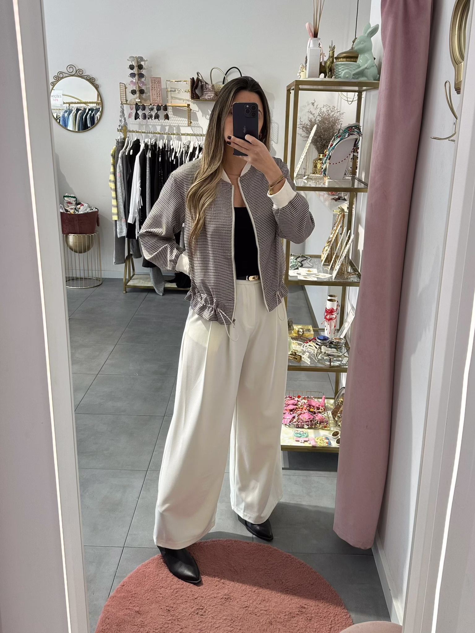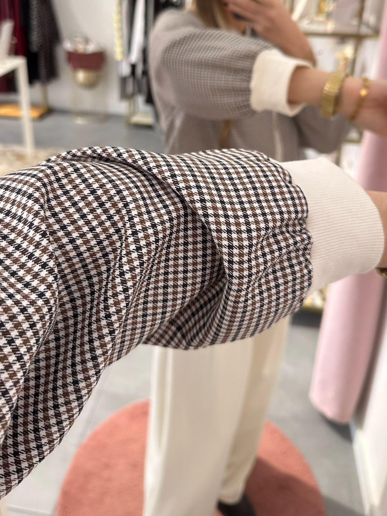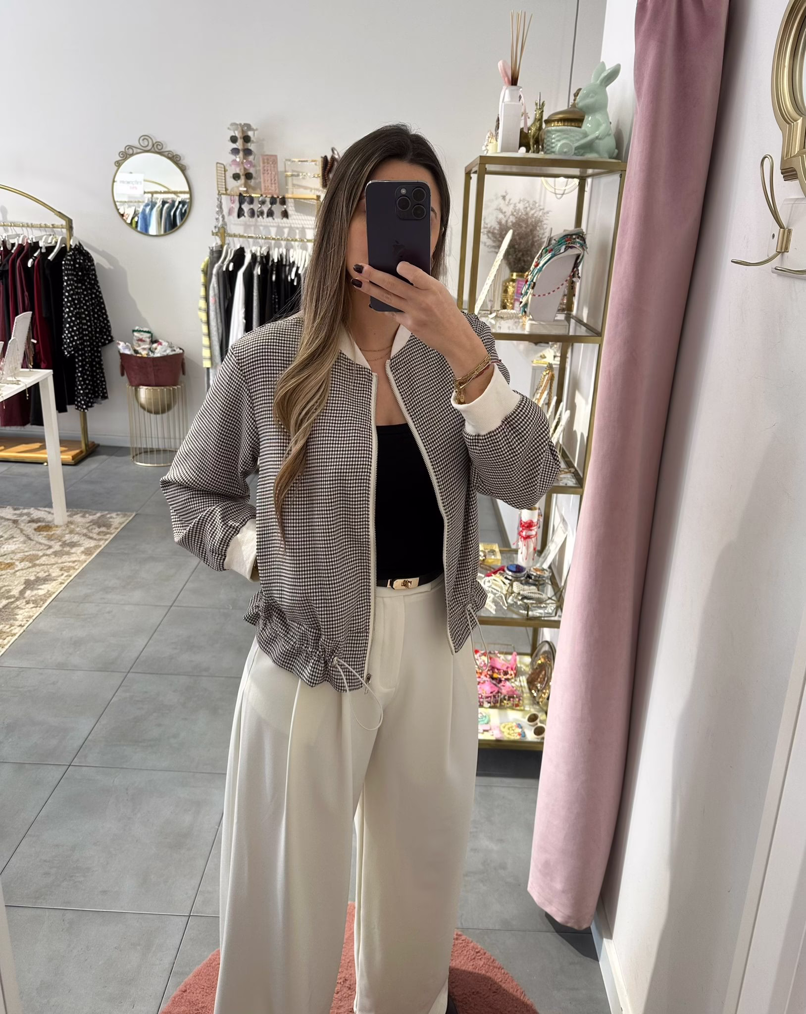Bomber em tecido xadrez castanho, bege e preto. É ajustável na zona da cintura, tem bolsos e paerta com fecho. É forrado.
