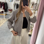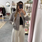 A modelo tem 1,73m e veste o tamanho M/L parte de cima e um 38/40 de parte de baixo.