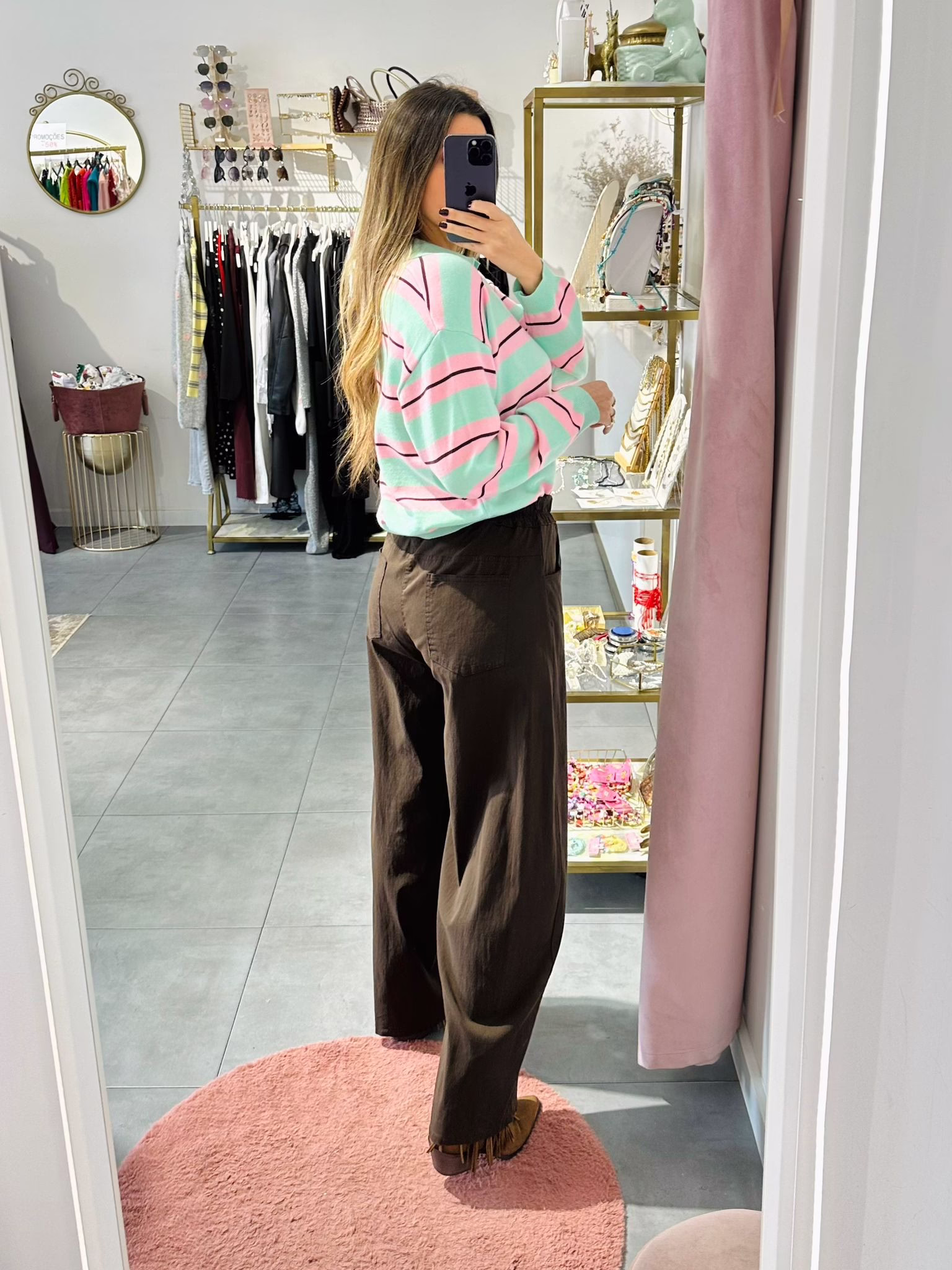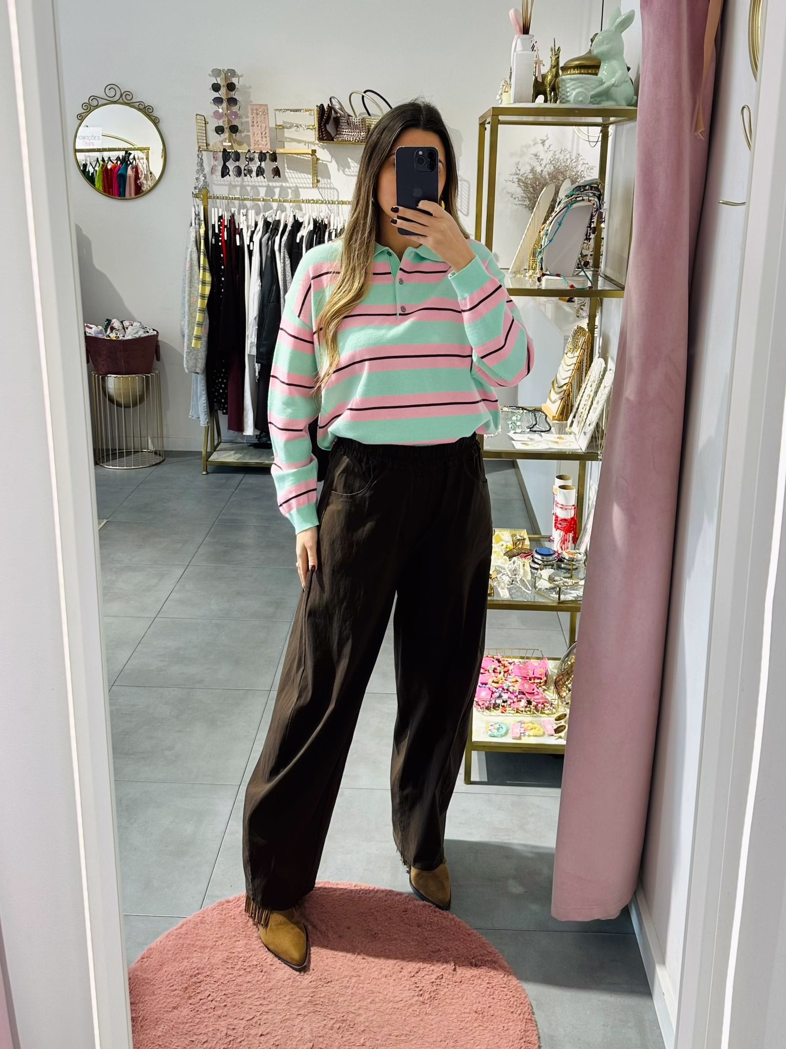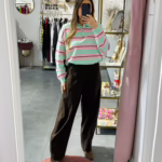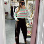 A modelo tem 1,73m e veste o tamanho M/L parte de cima e um 38/40 de parte de baixo.