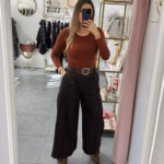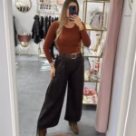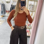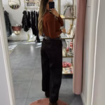 A modelo tem 1,73m e veste o tamanho M/L parte de cima e um 38/40 de parte de baixo.