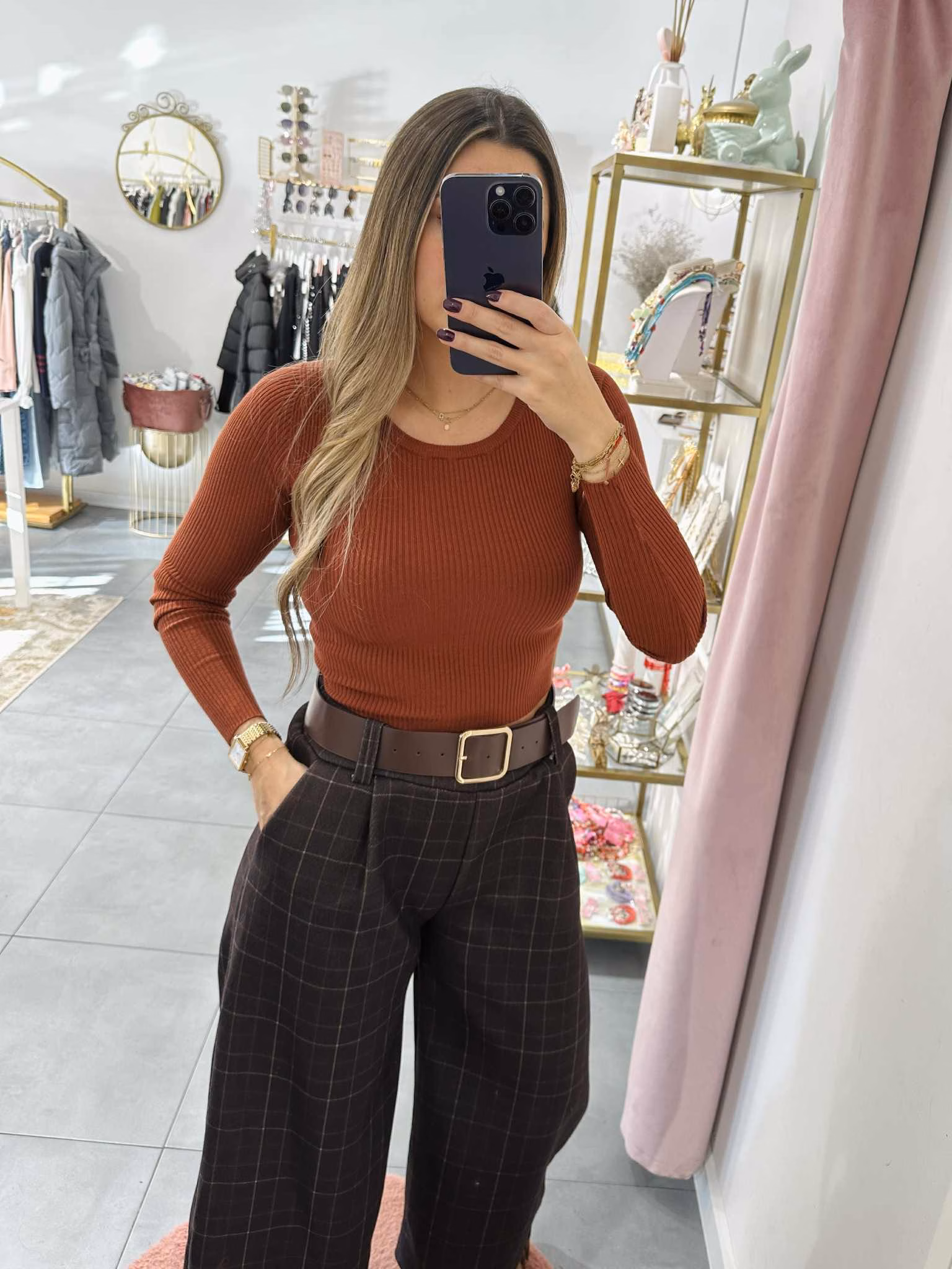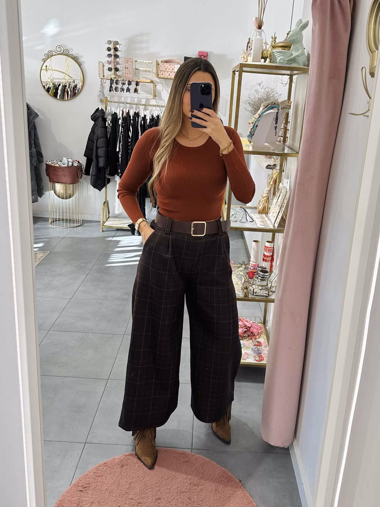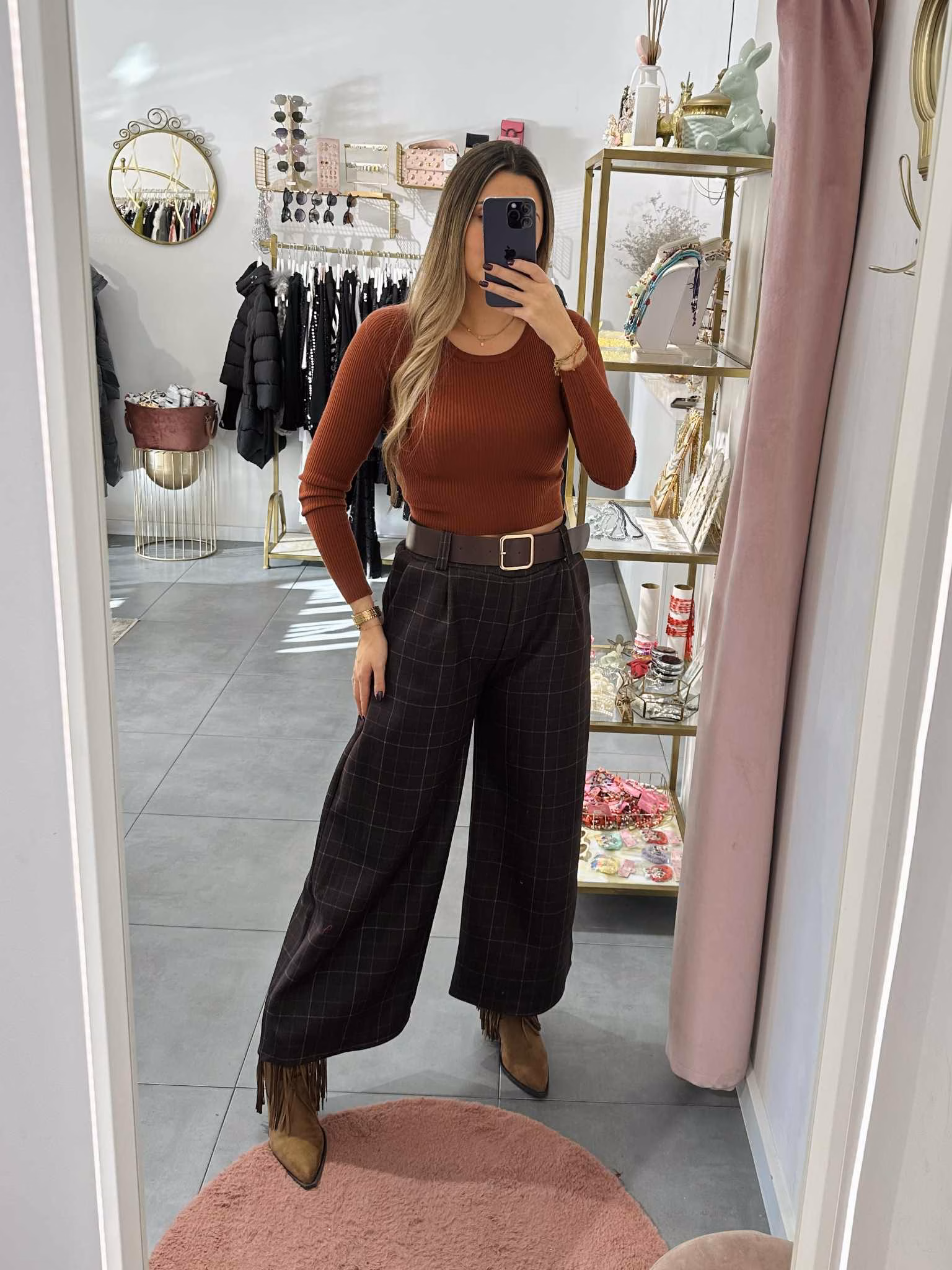 Calça em tecido tipo flanela com elástico na cinta, o cinto está incluído. O tecido é castanho com riscas beges, castanhas e azuis.