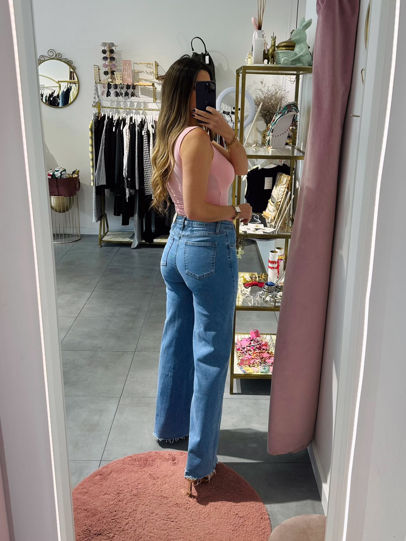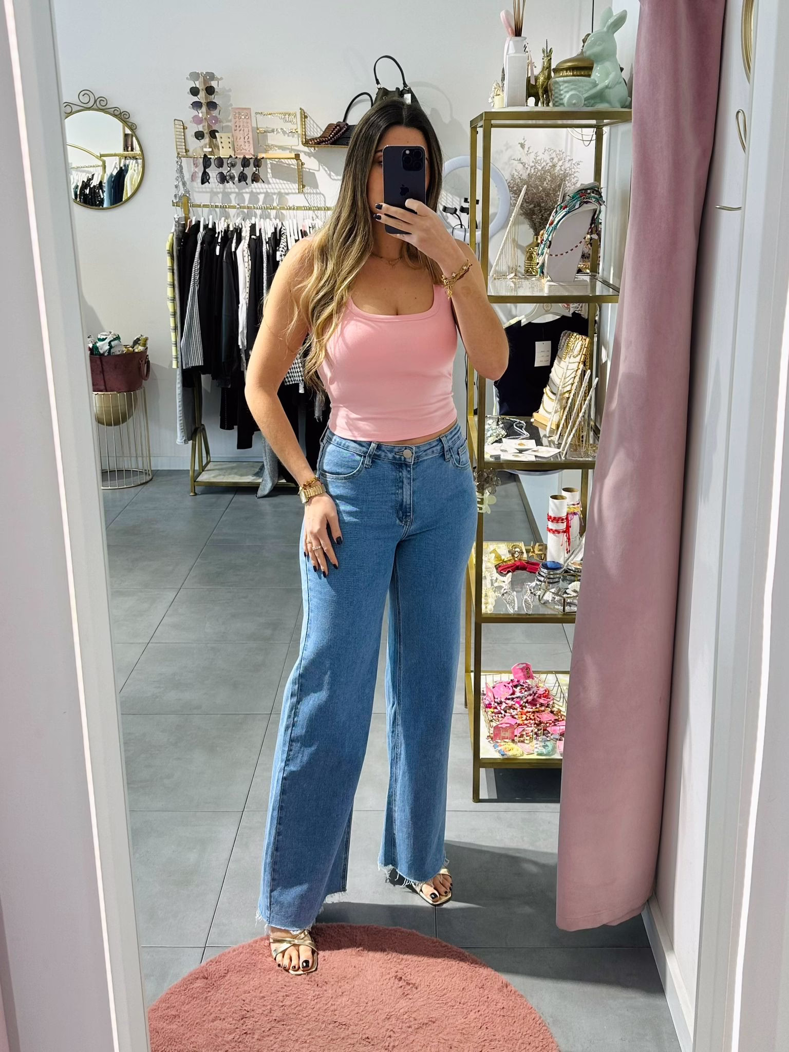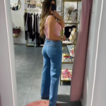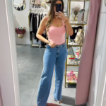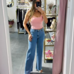 A modelo tem 1,73m e veste o tamanho M/L parte de cima e um 38/40 de parte de baixo.