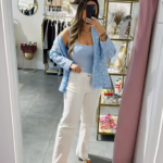 A modelo tem 1,73m e veste o tamanho M/L parte de cima e um 38/40 de parte de baixo.