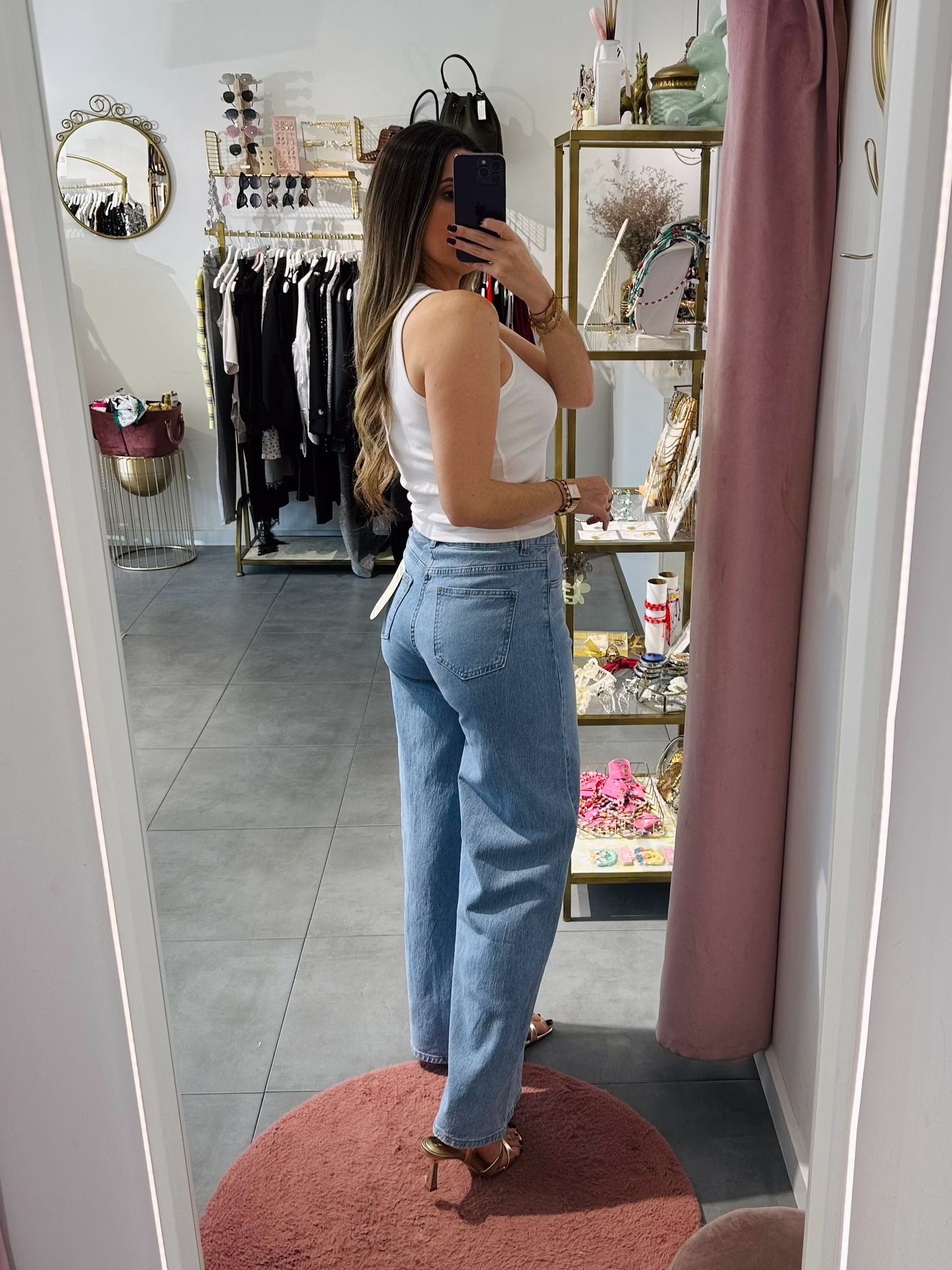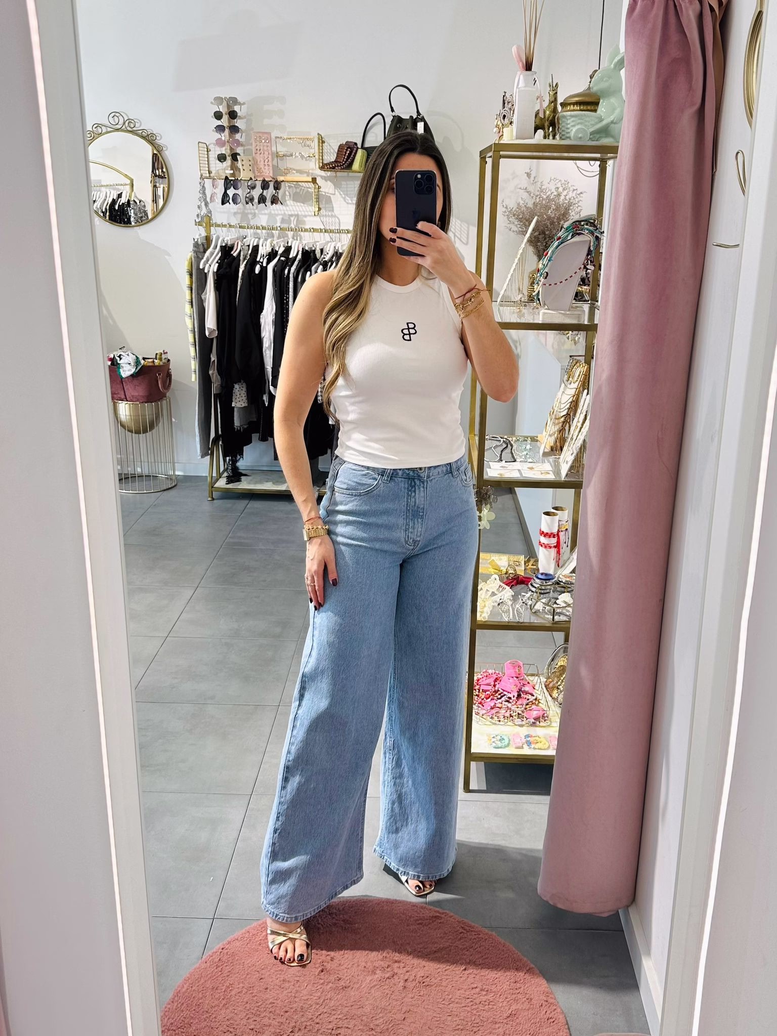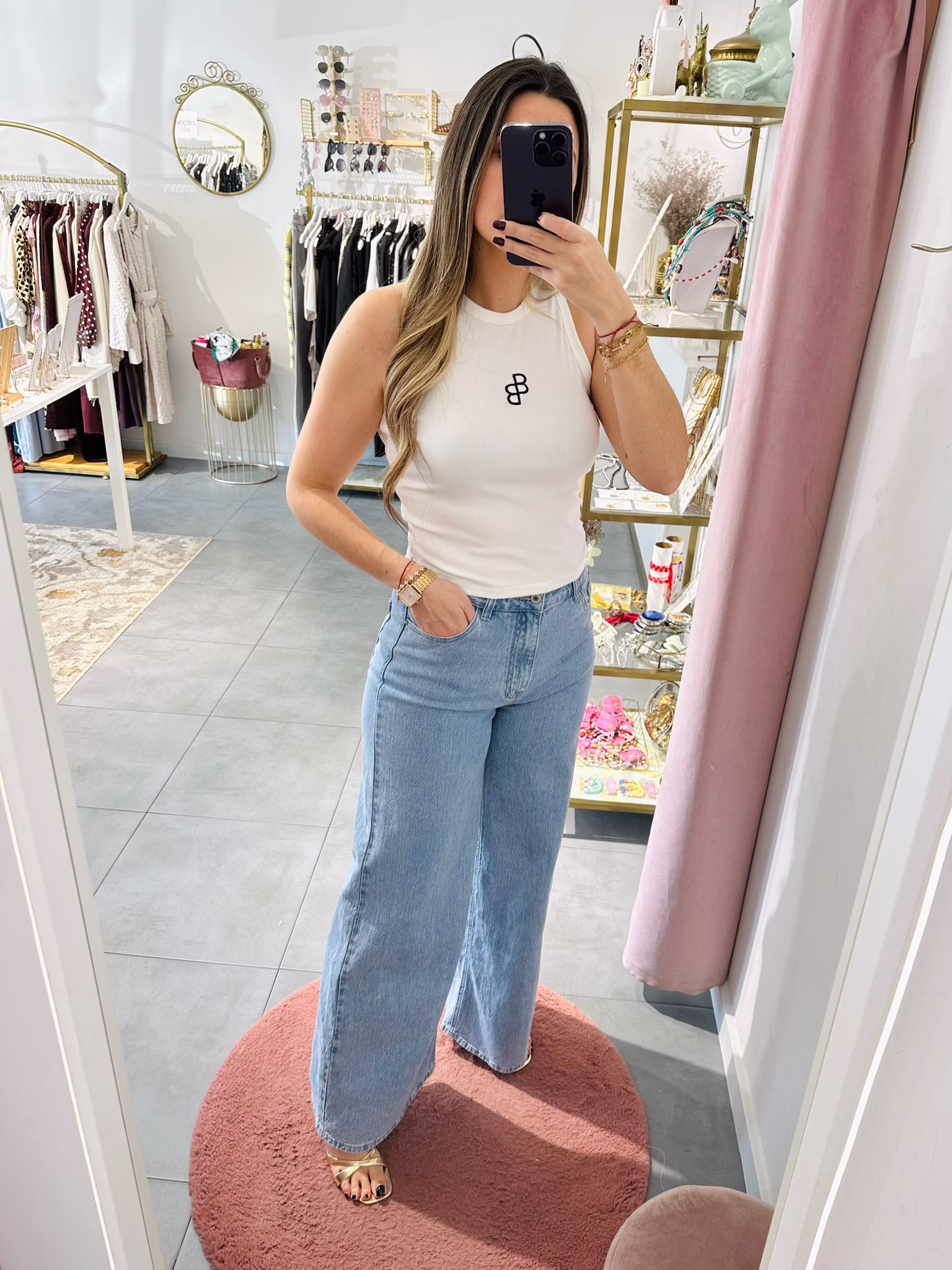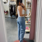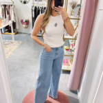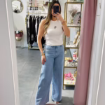 A modelo tem 1,73m e veste o tamanho M parte de cima e um 38/40 de parte de baixo.