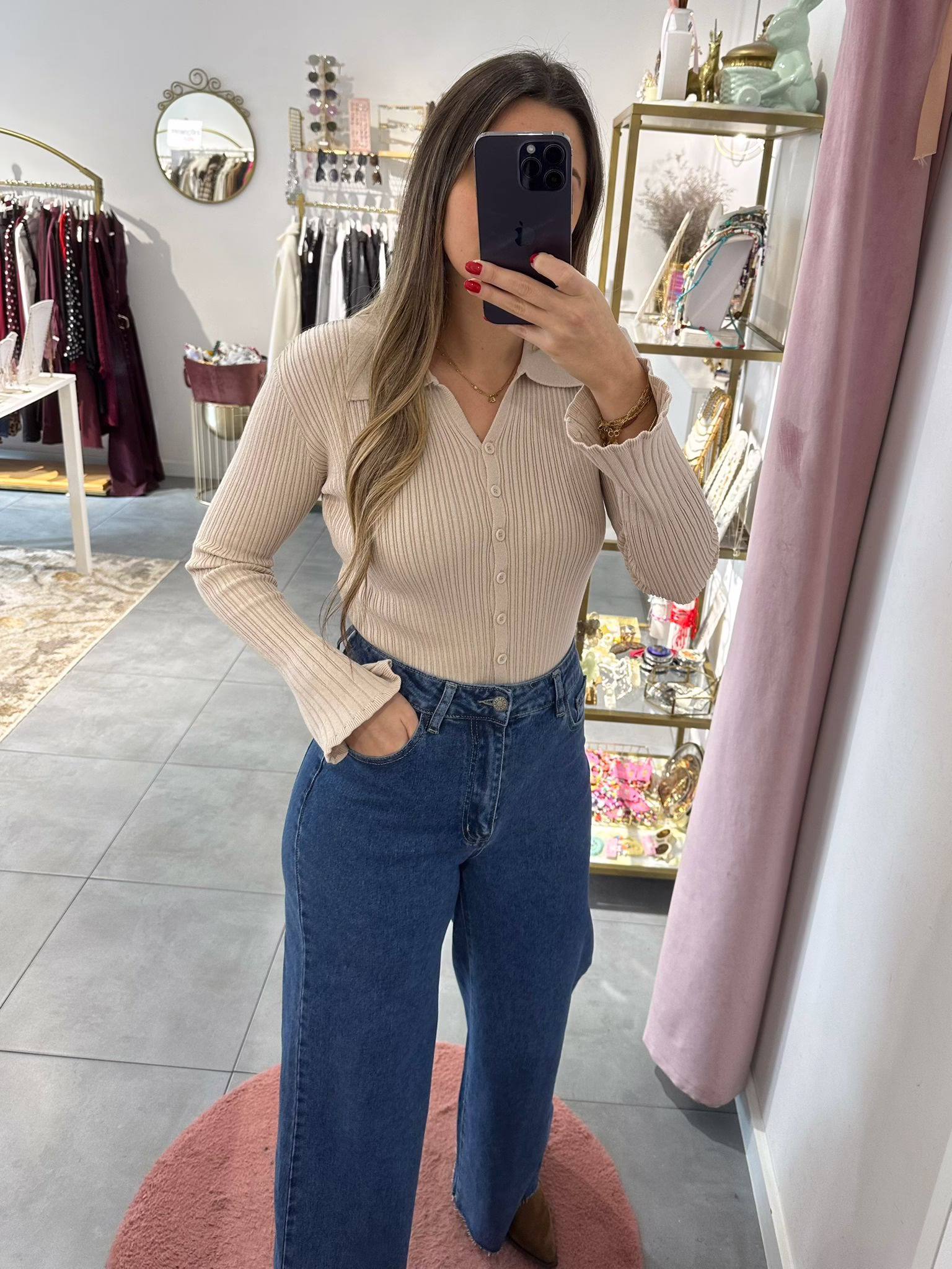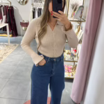 A modelo tem 1,73m e veste o tamanho M/L parte de cima e um 38/40 de parte de baixo.