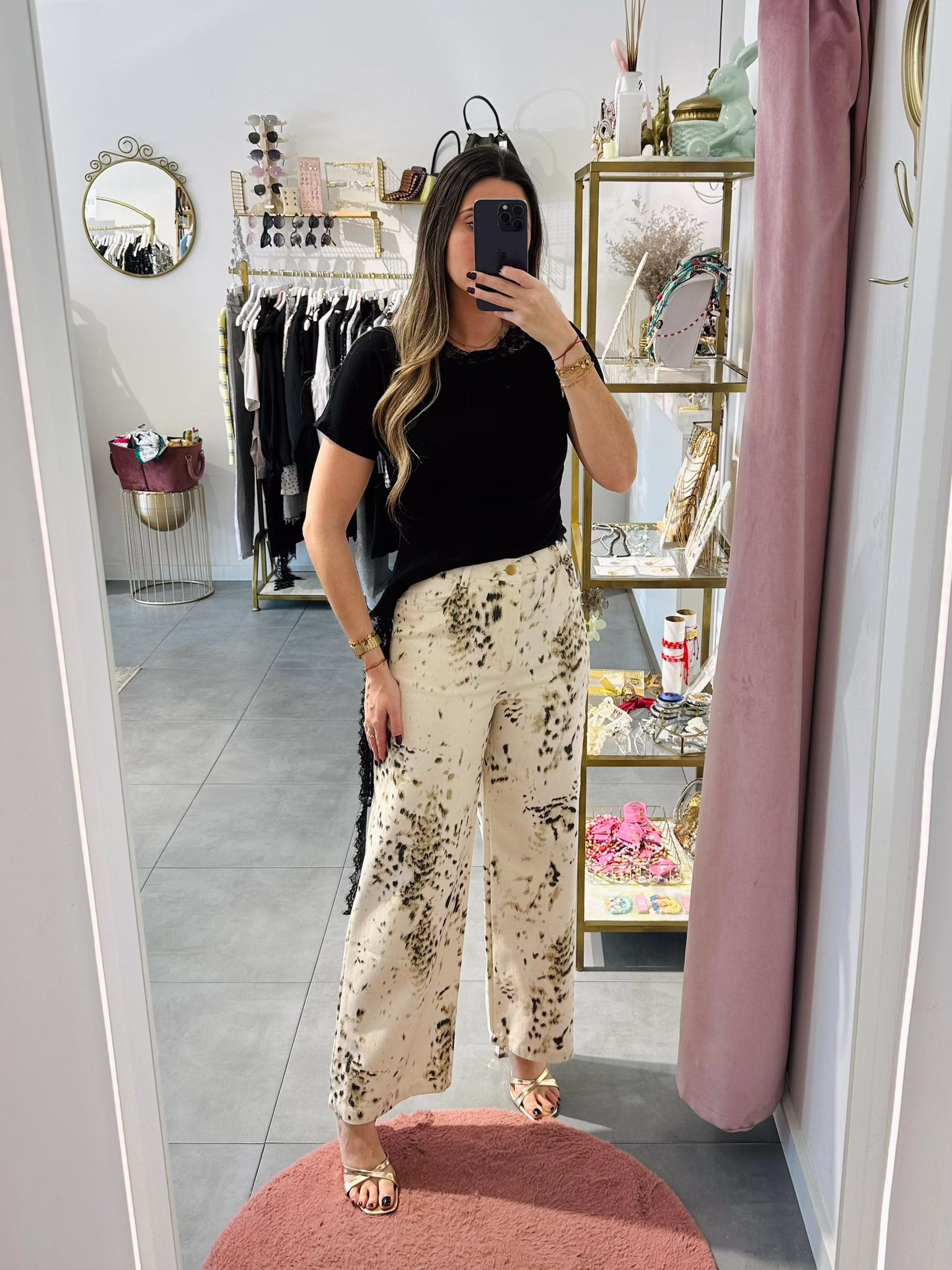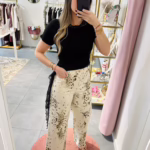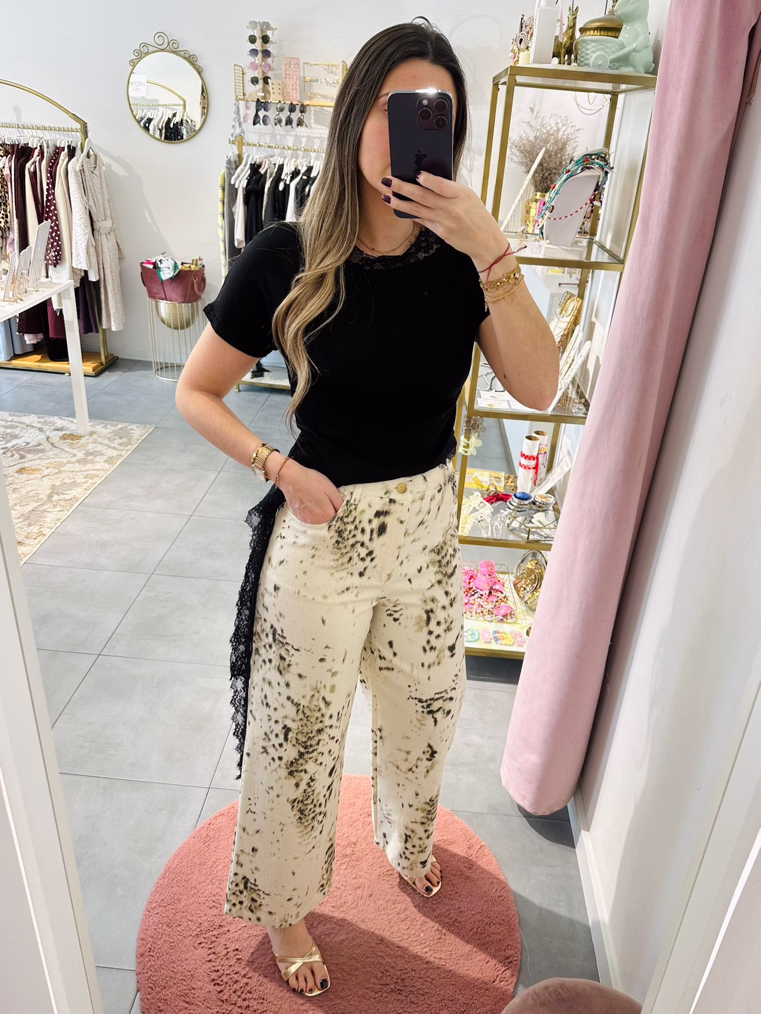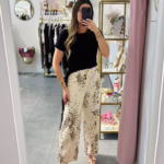 Calça wid leg com padrão bege e preto, não tem elásticidade.
