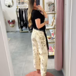 A modelo tem 1,73m e veste o tamanho M/L parte de cima e um 38/40 de parte de baixo.
