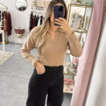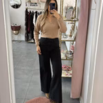 A modelo tem 1,73m e veste o tamanho M/L parte de cima e um 38/40 de parte de baixo.