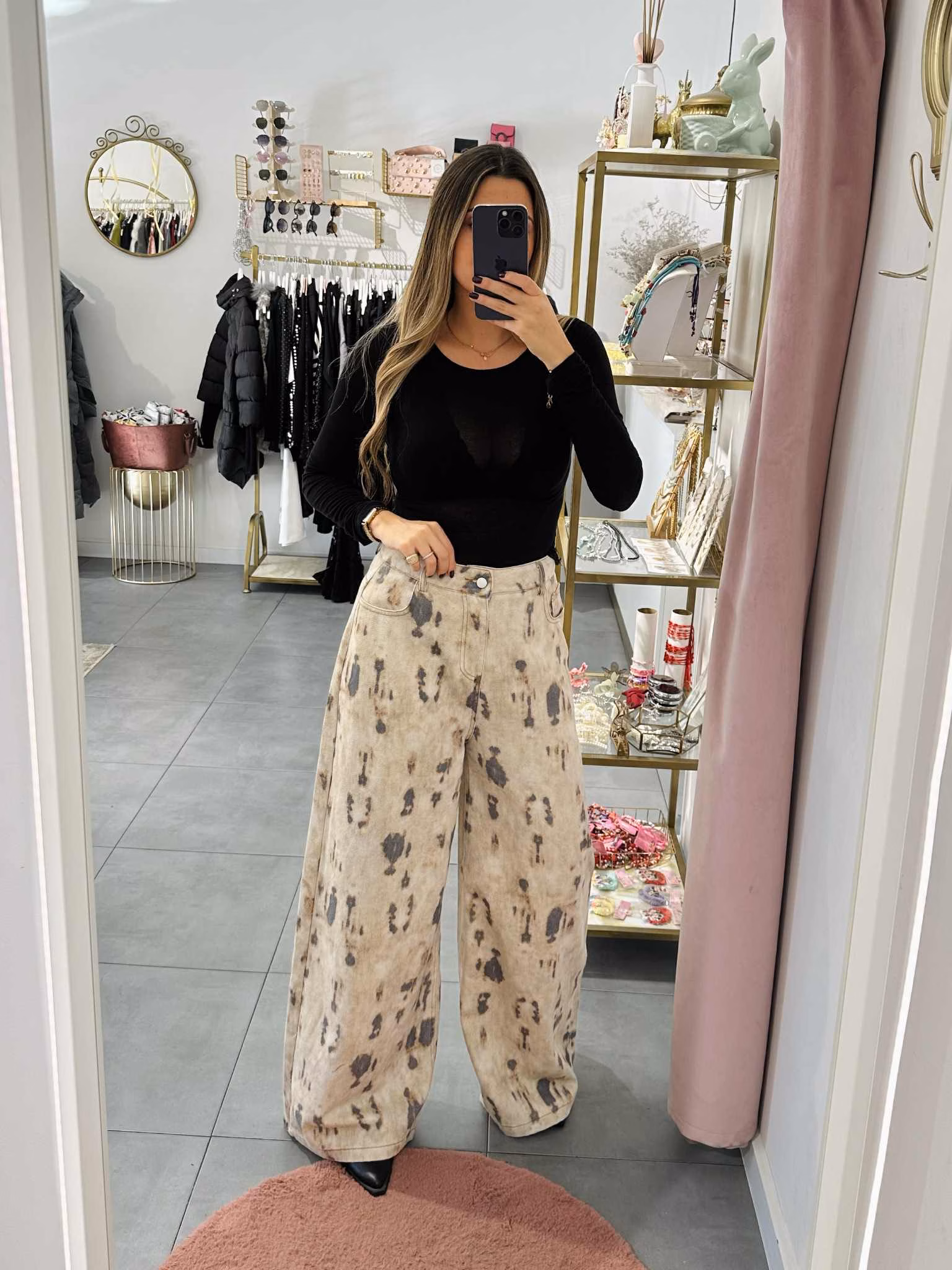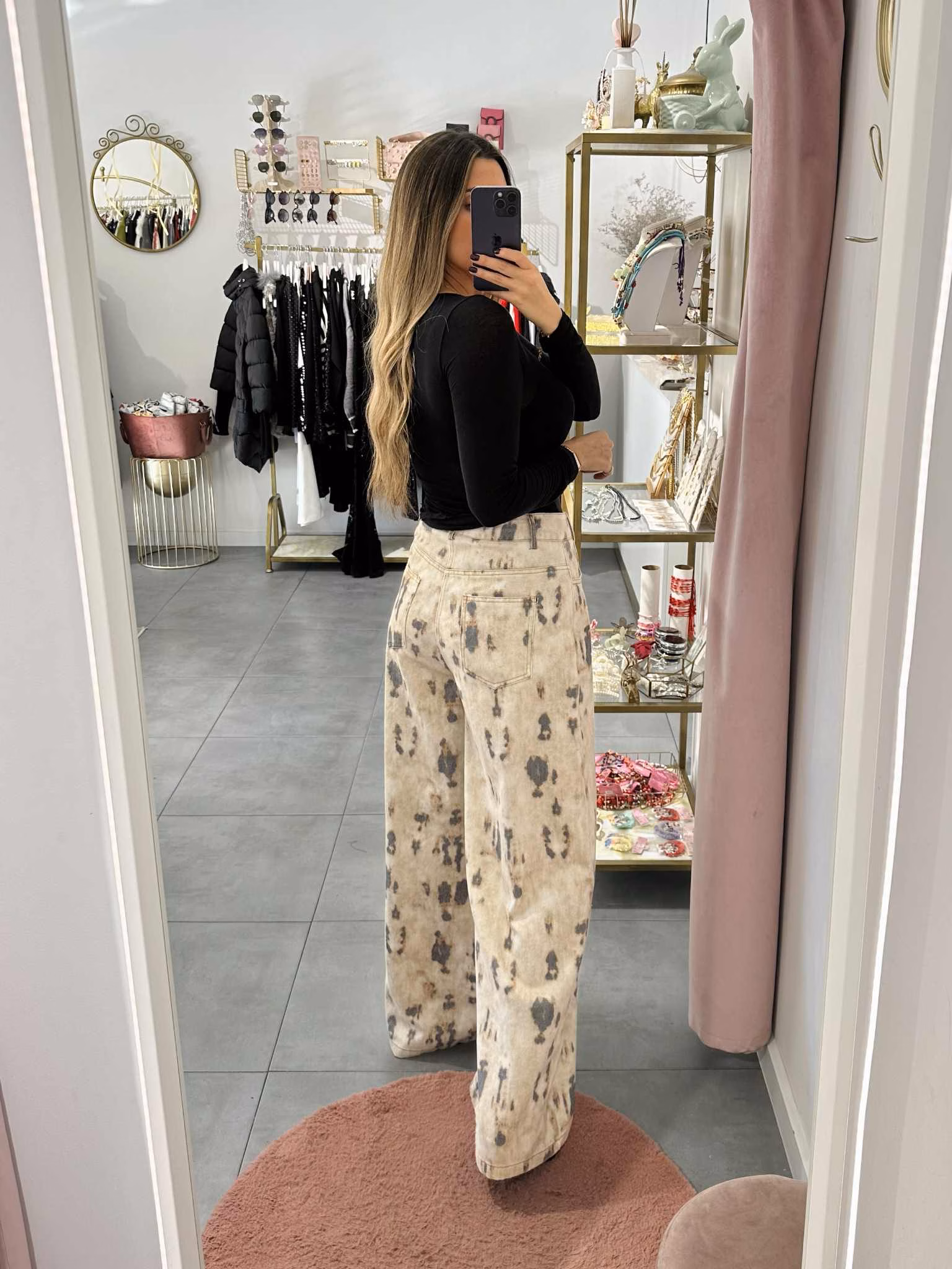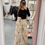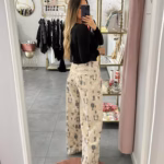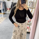 A modelo tem 1,73m e veste o tamanho M/L parte de cima e um 38/40 de parte de baixo.