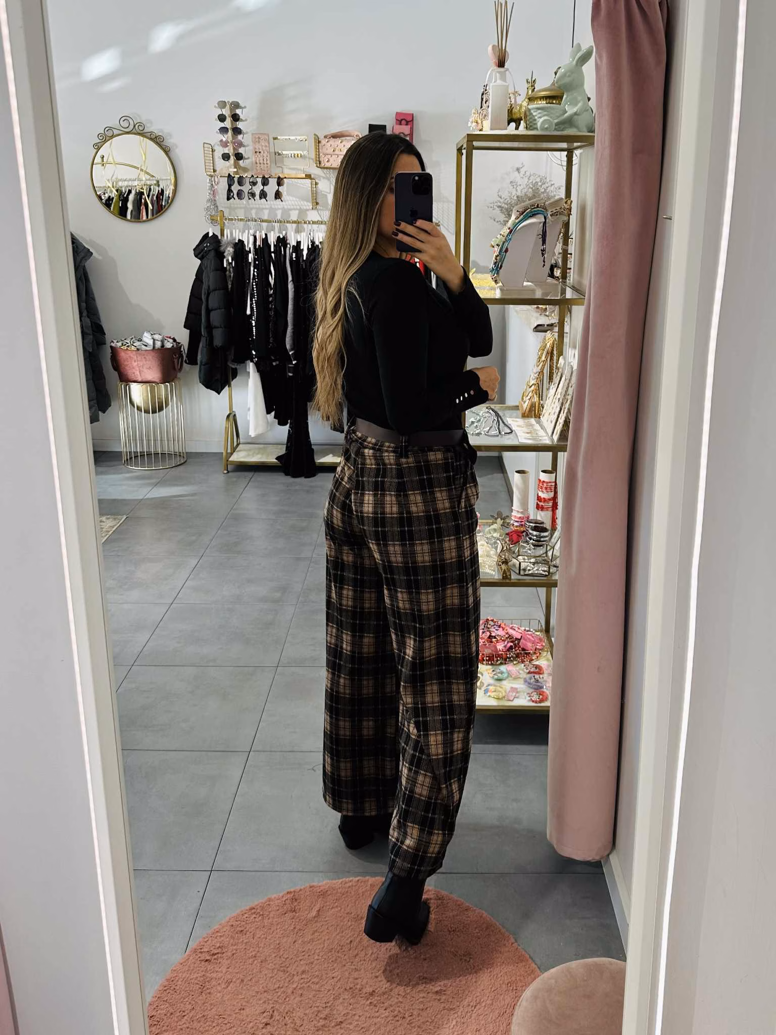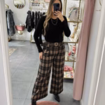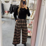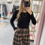 A modelo tem 1,73m e veste o tamanho M/L parte de cima e um 38/40 de parte de baixo.
