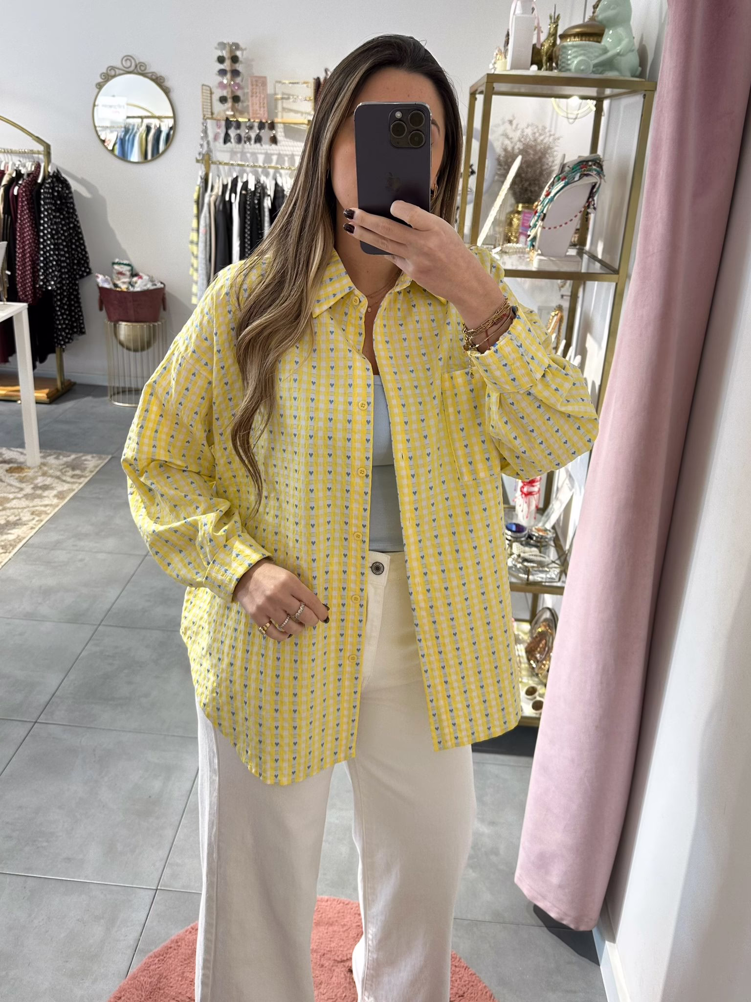 Camiseiro com riscas e corações nos tons de amarelo e azul.
