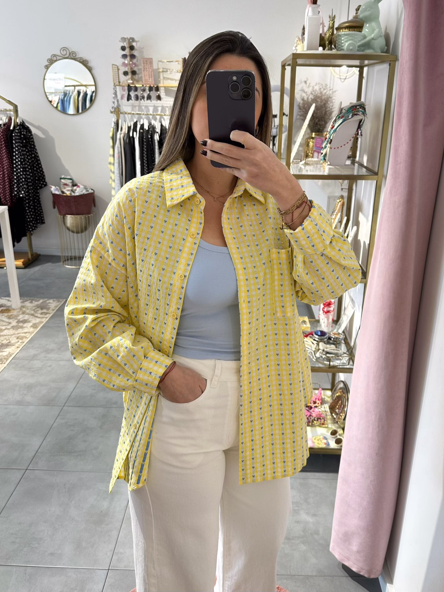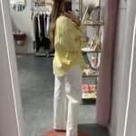 A modelo tem 1,73m e veste o tamanho M/L parte de cima e um 38/40 de parte de baixo.