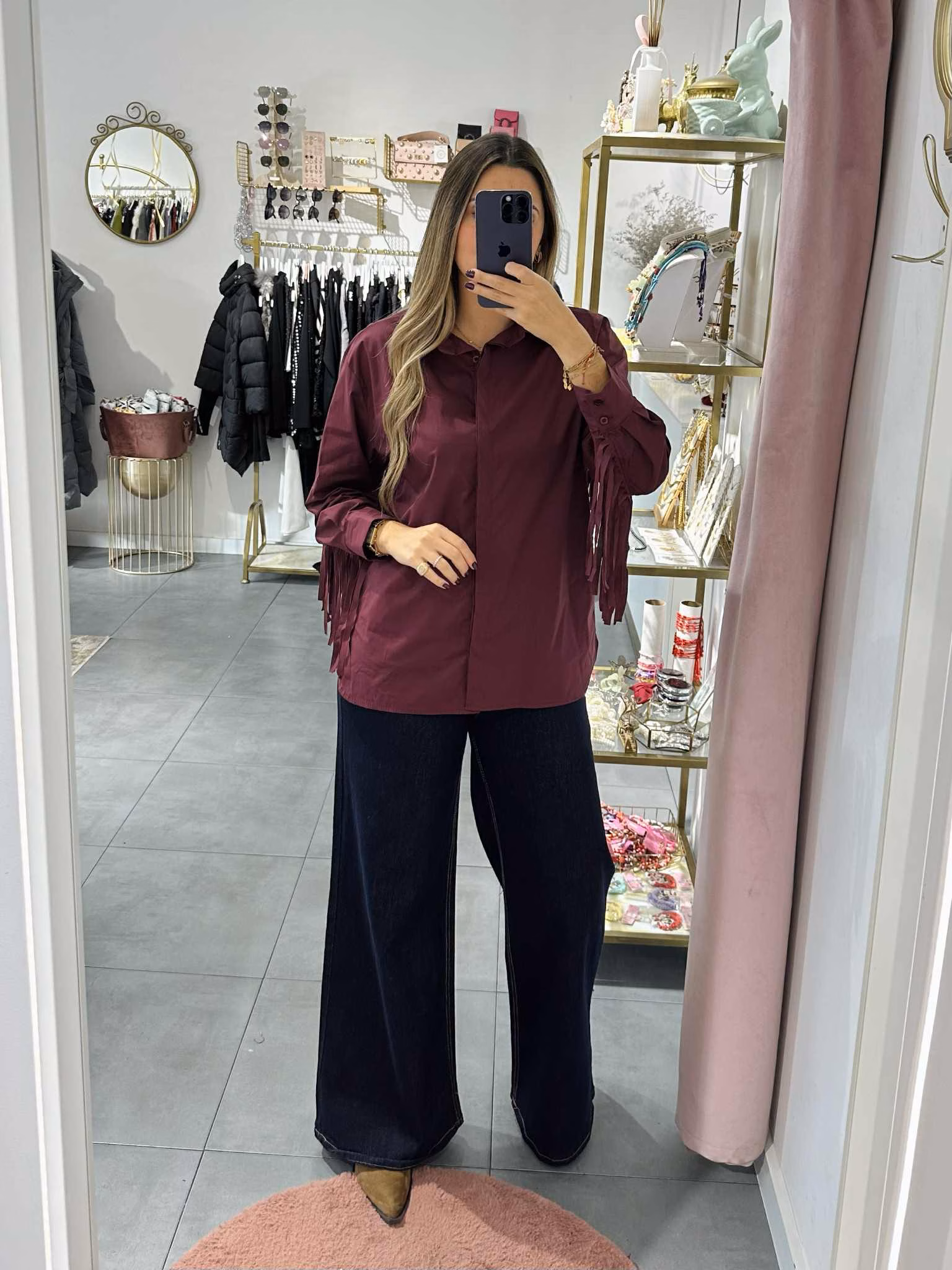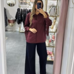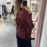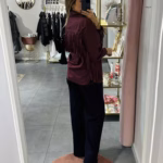 A modelo tem 1,73m e veste o tamanho M/L parte de cima e um 38/40 de parte de baixo.