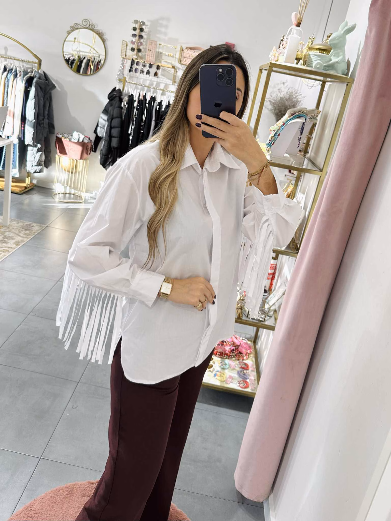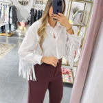 A modelo tem 1,73m e veste o tamanho M/L parte de cima e um 38/40 de parte de baixo.