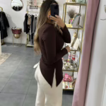 A modelo tem 1,73m e veste o tamanho M/L parte de cima e um 38/40 de parte de baixo.