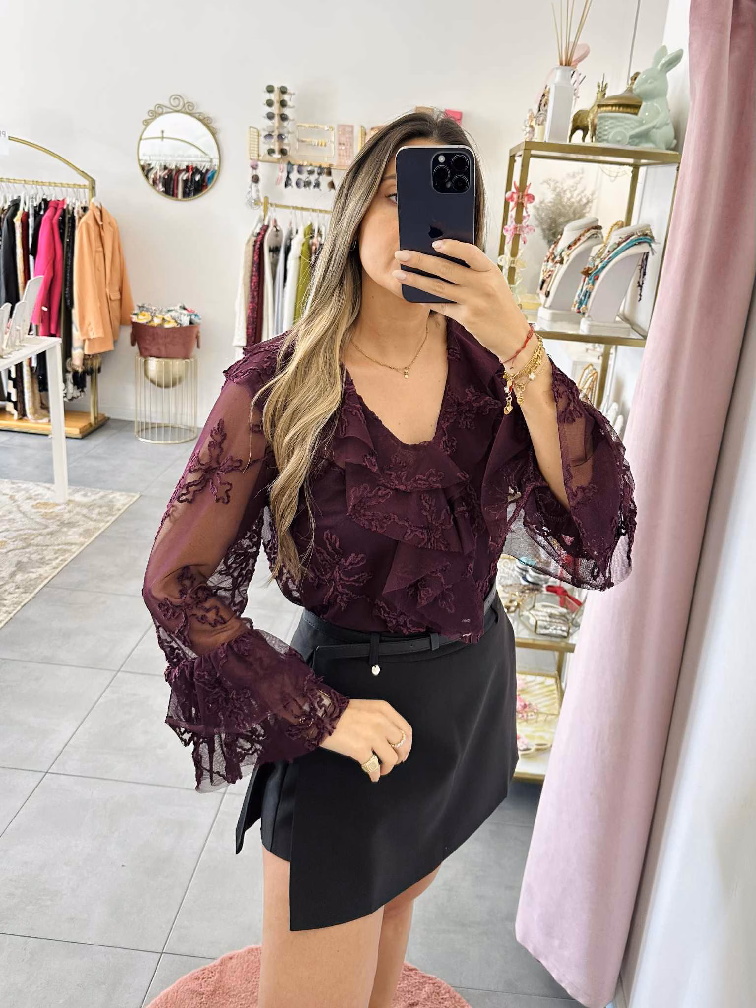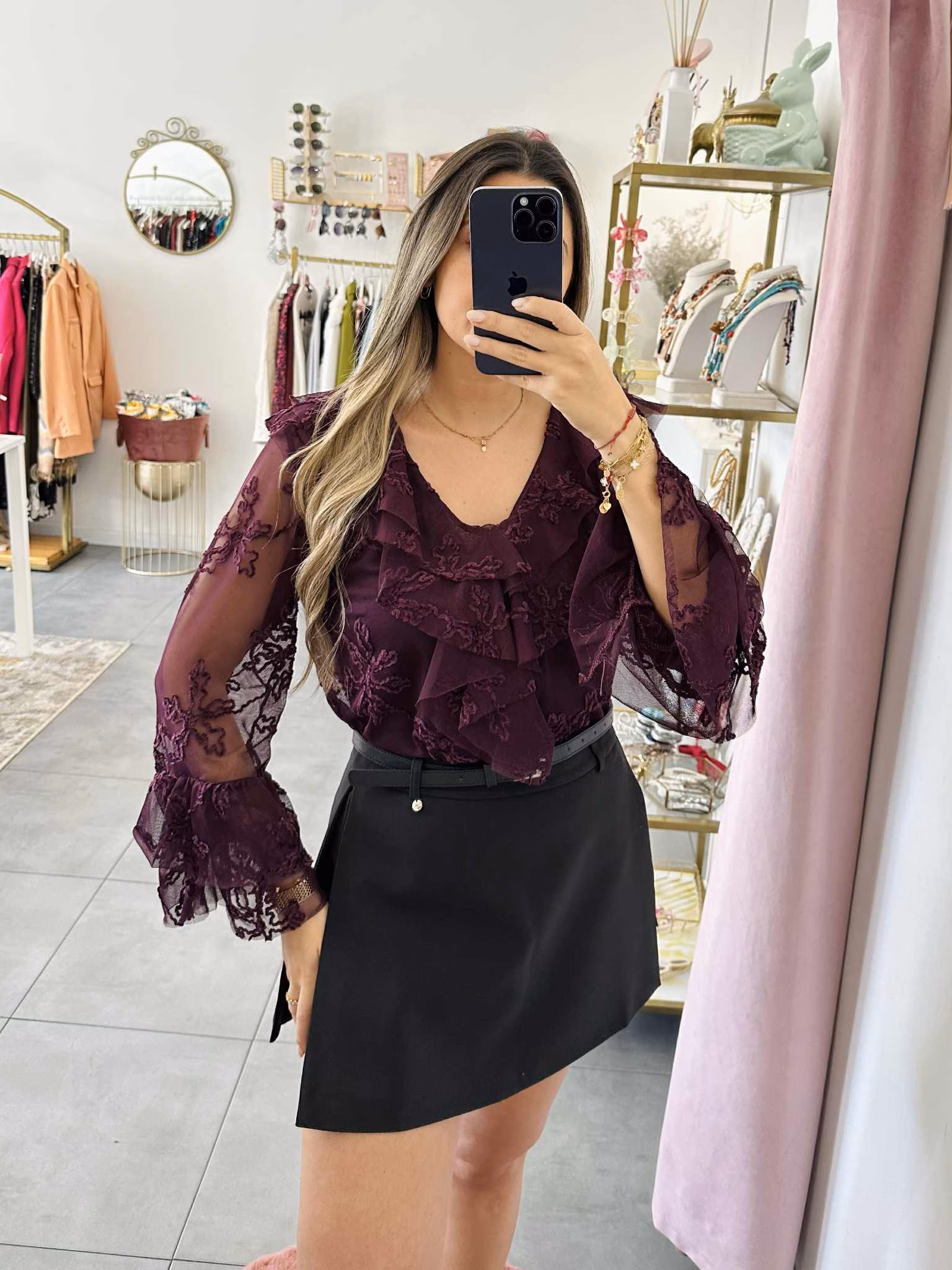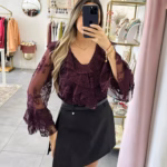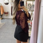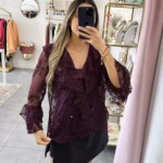 A modelo tem 1,73m e veste o tamanho M/L parte de cima e um 38/40 de parte de baixo.