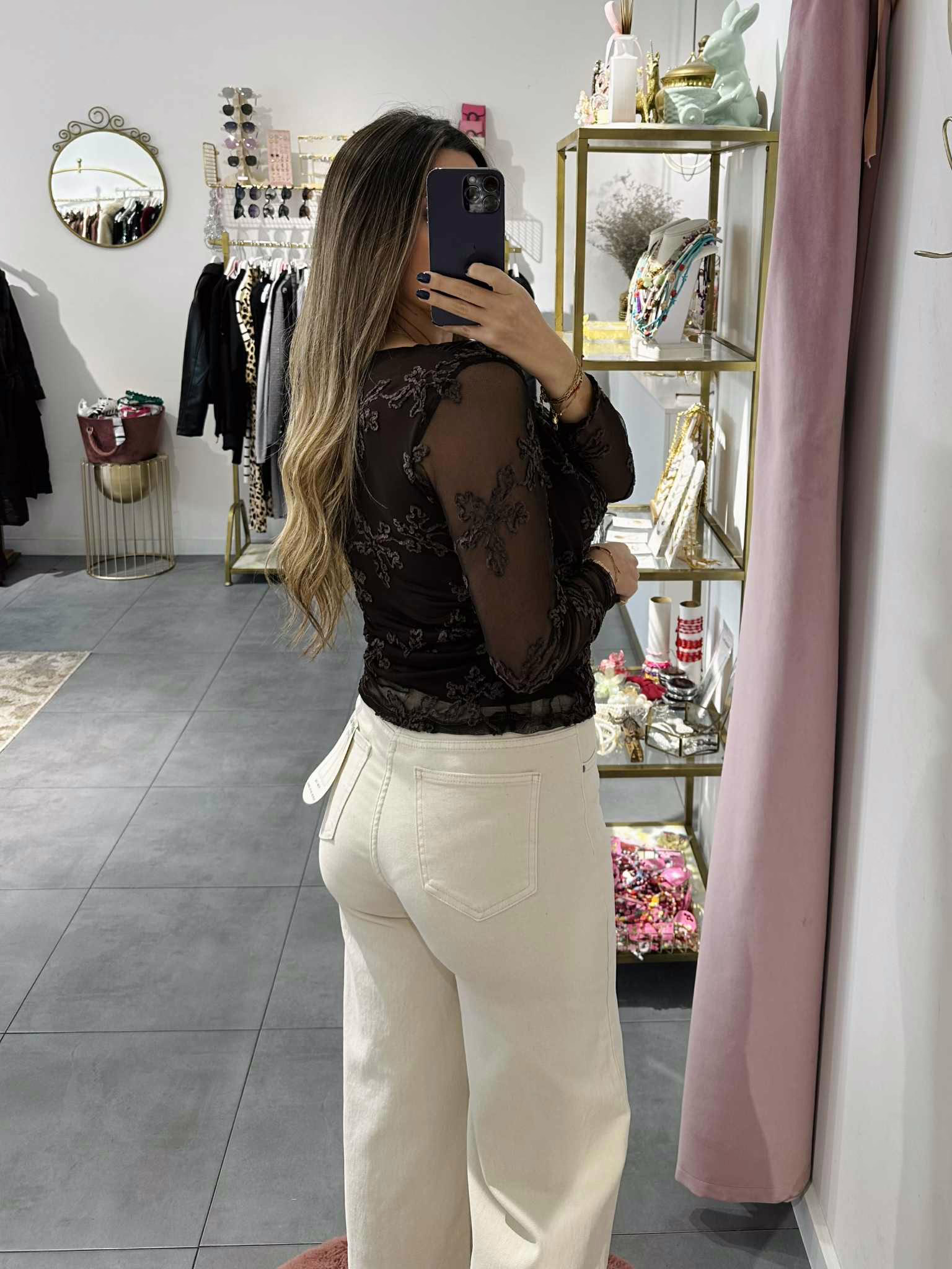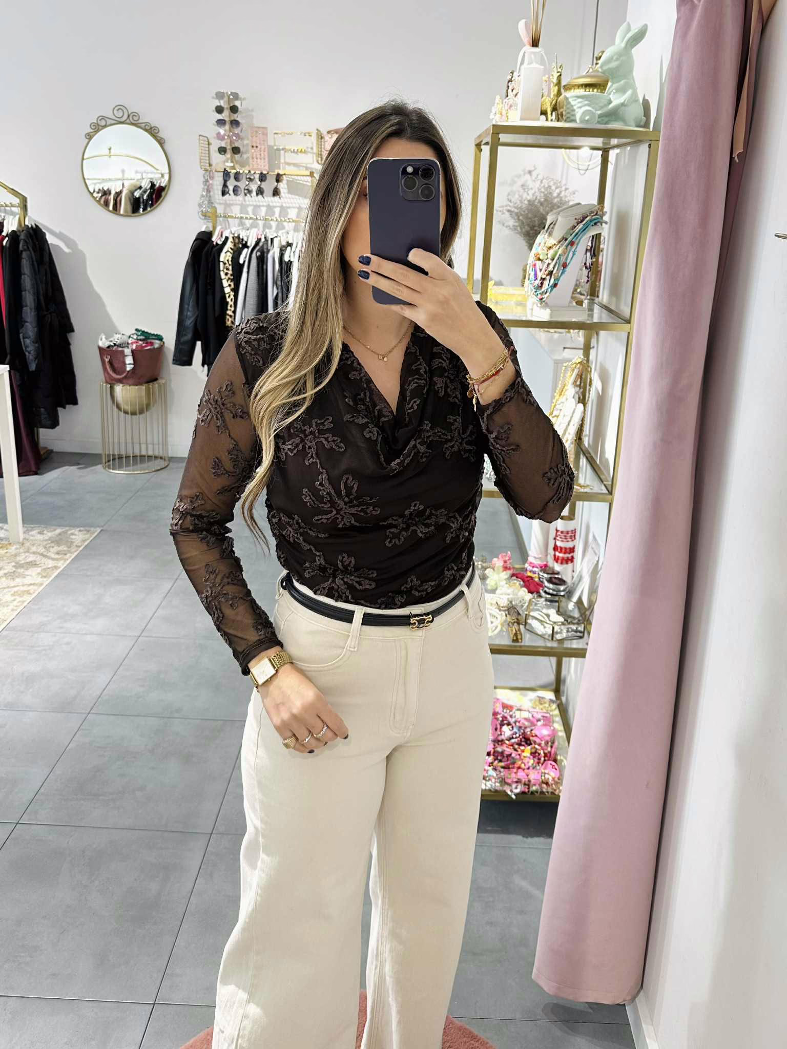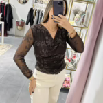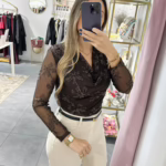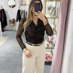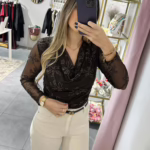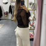A modelo tem 1,73m e veste o tamanho M/L parte de cima e um 38/40 de parte de baixo.