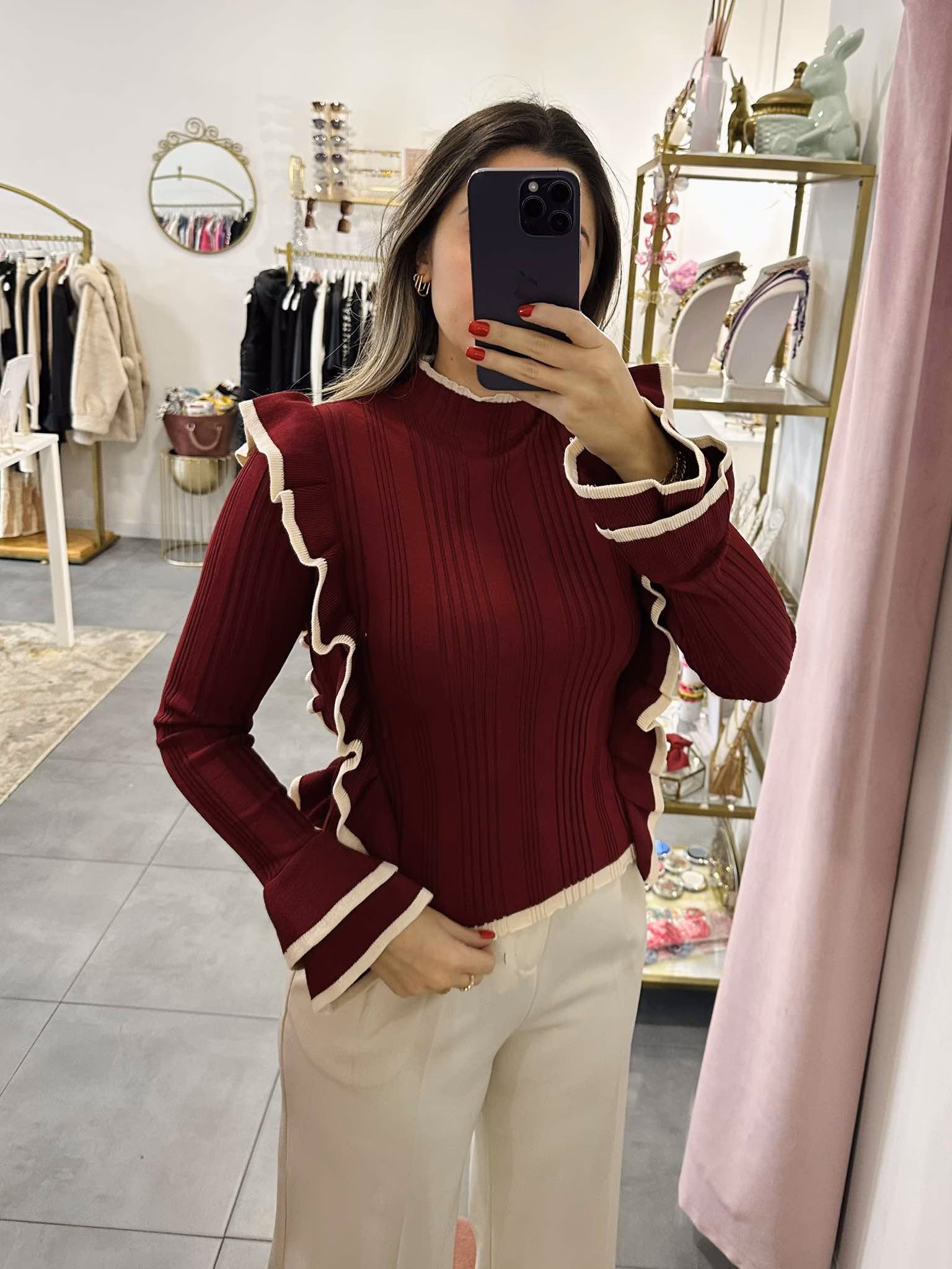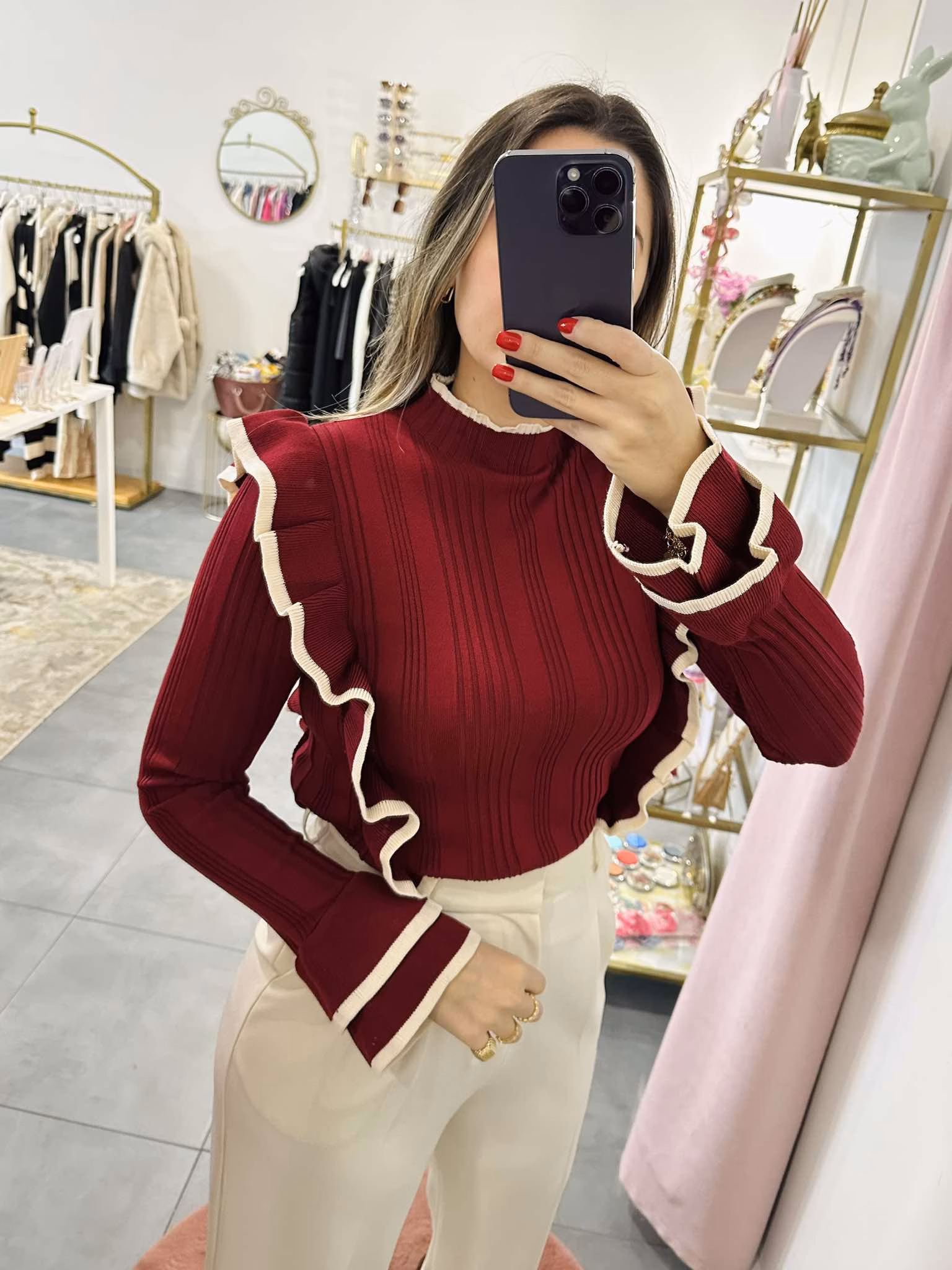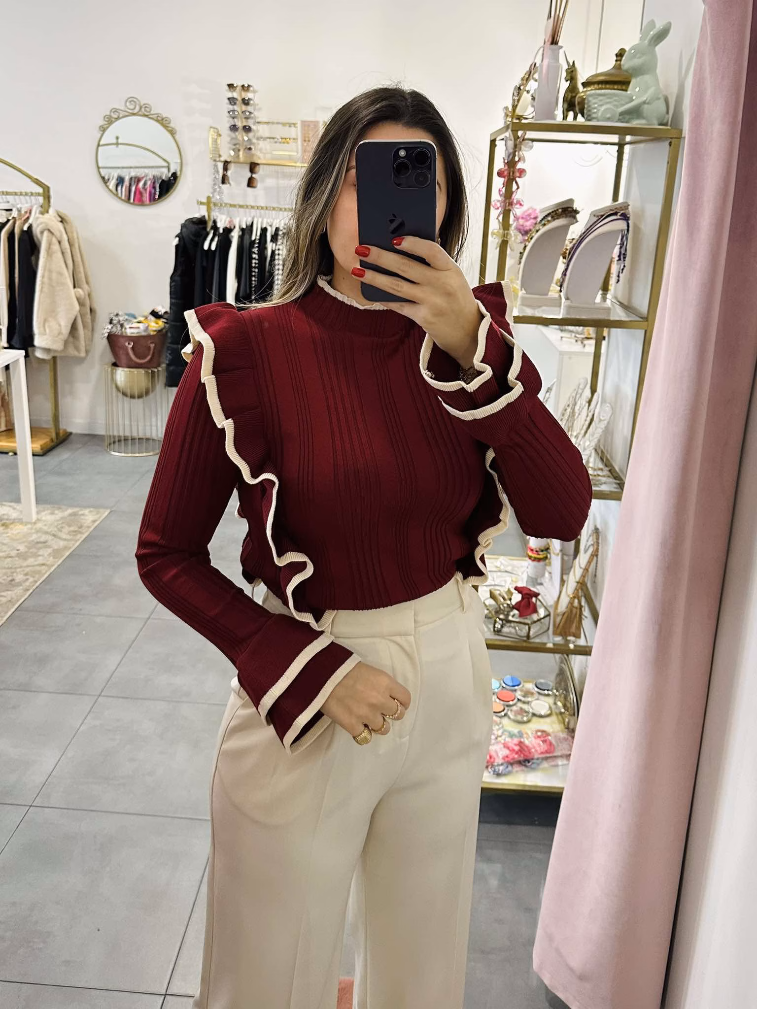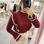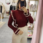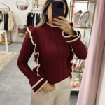 A modelo tem 1,73m e veste o tamanho M parte de cima e um 38/40 de parte de baixo.