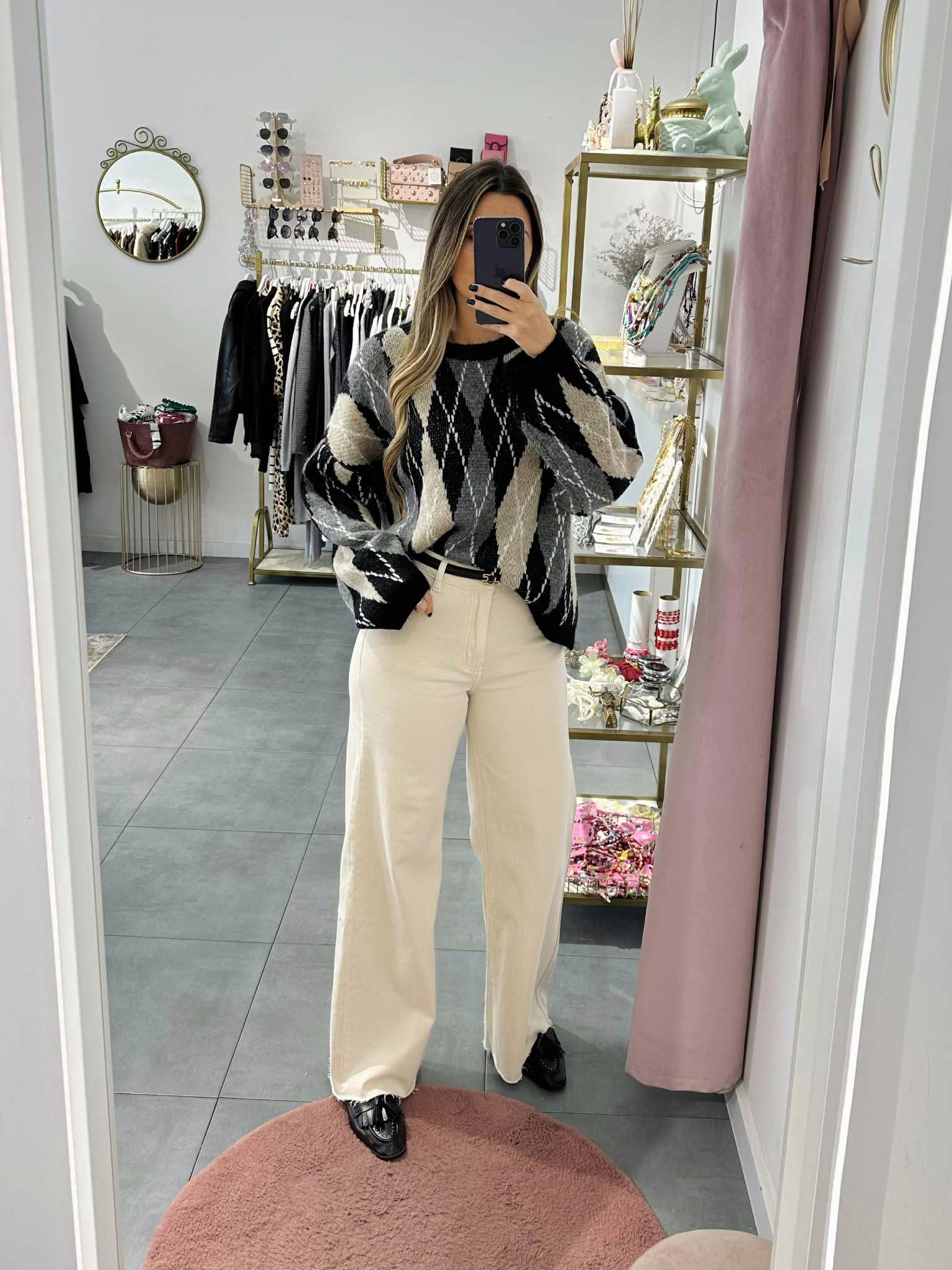 A modelo tem 1,73m e veste o tamanho M/L parte de cima e um 38/40 de parte de baixo.