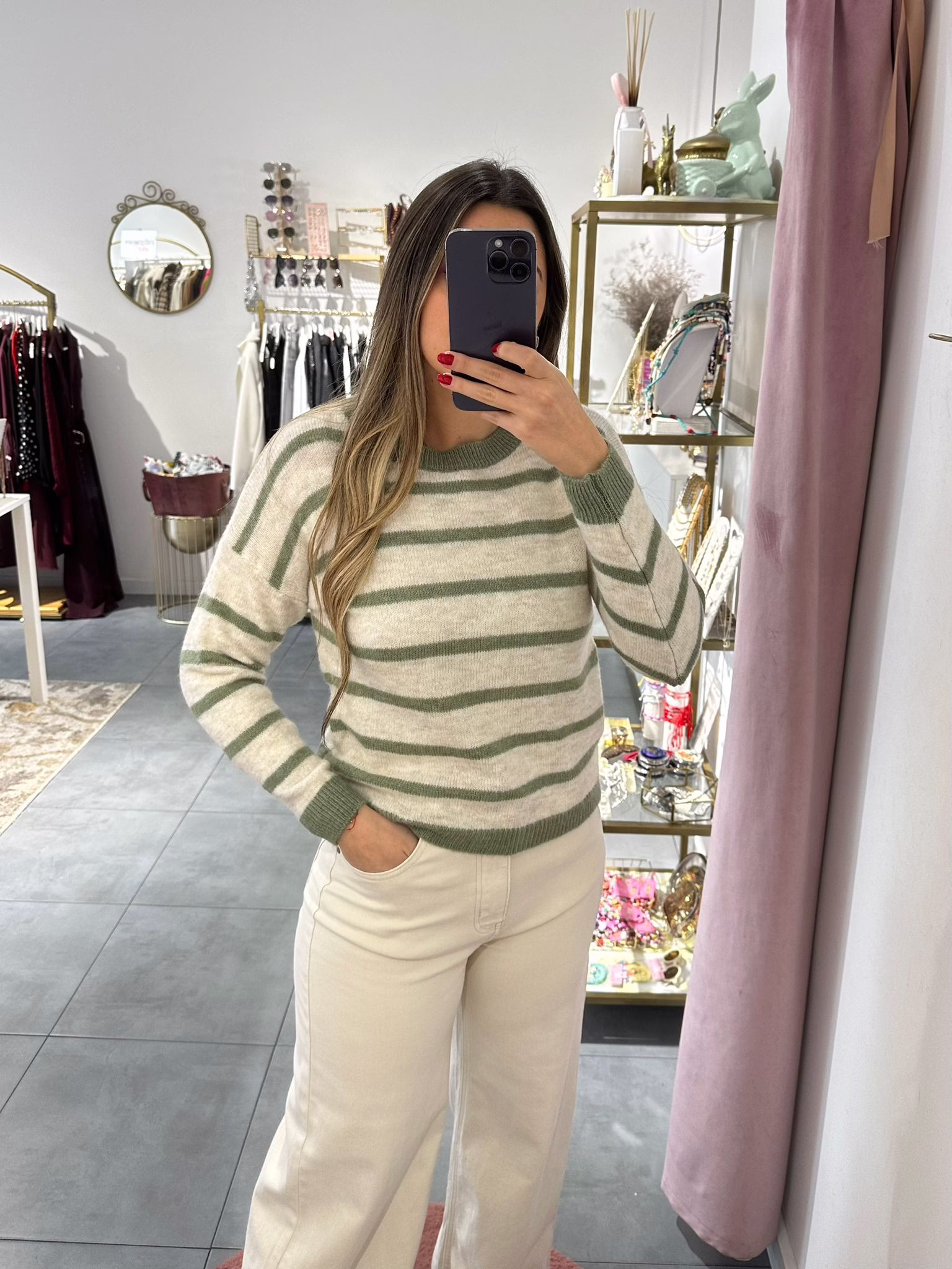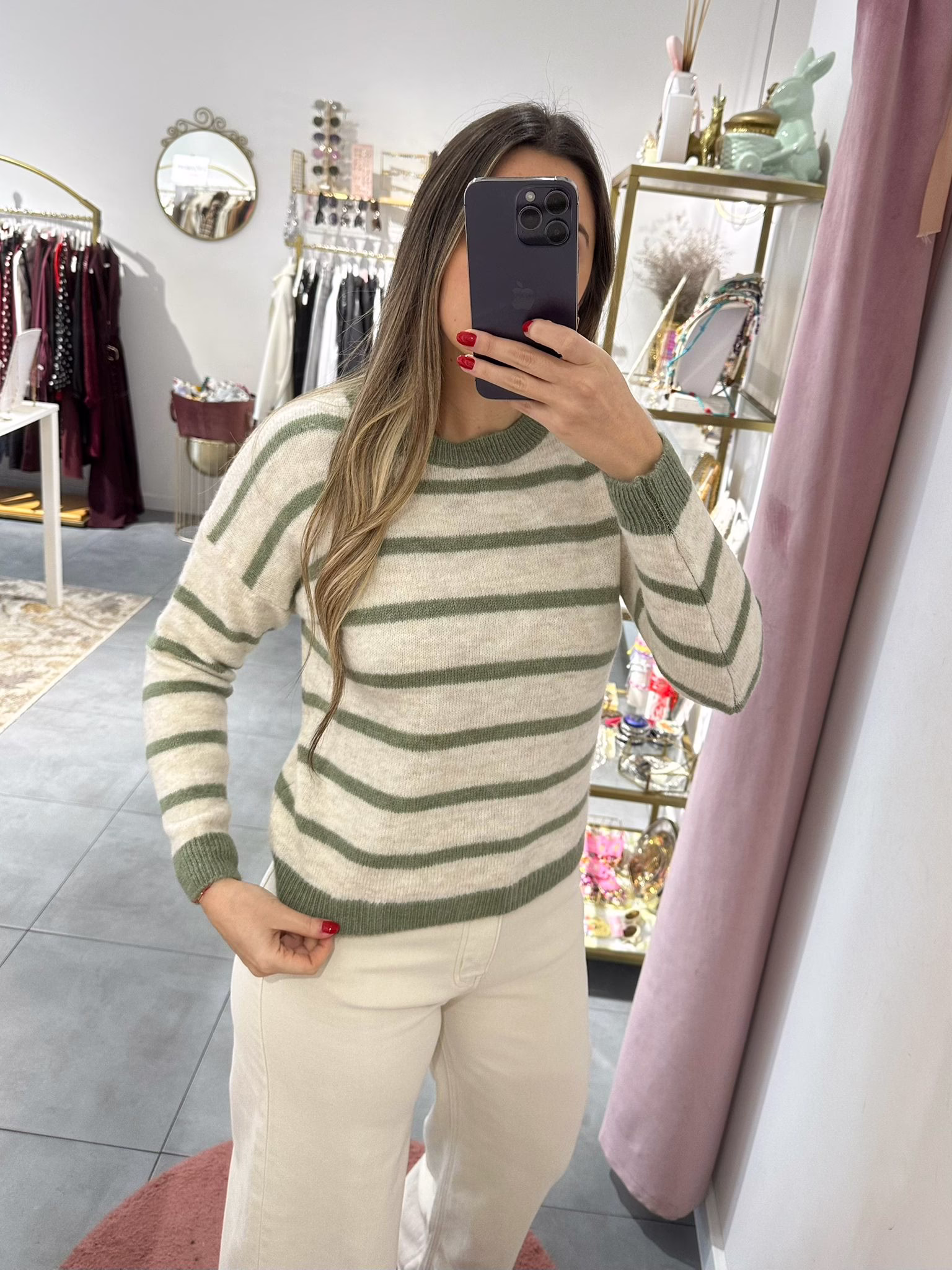 Camisola em malha suave, bege com riscas verdes.