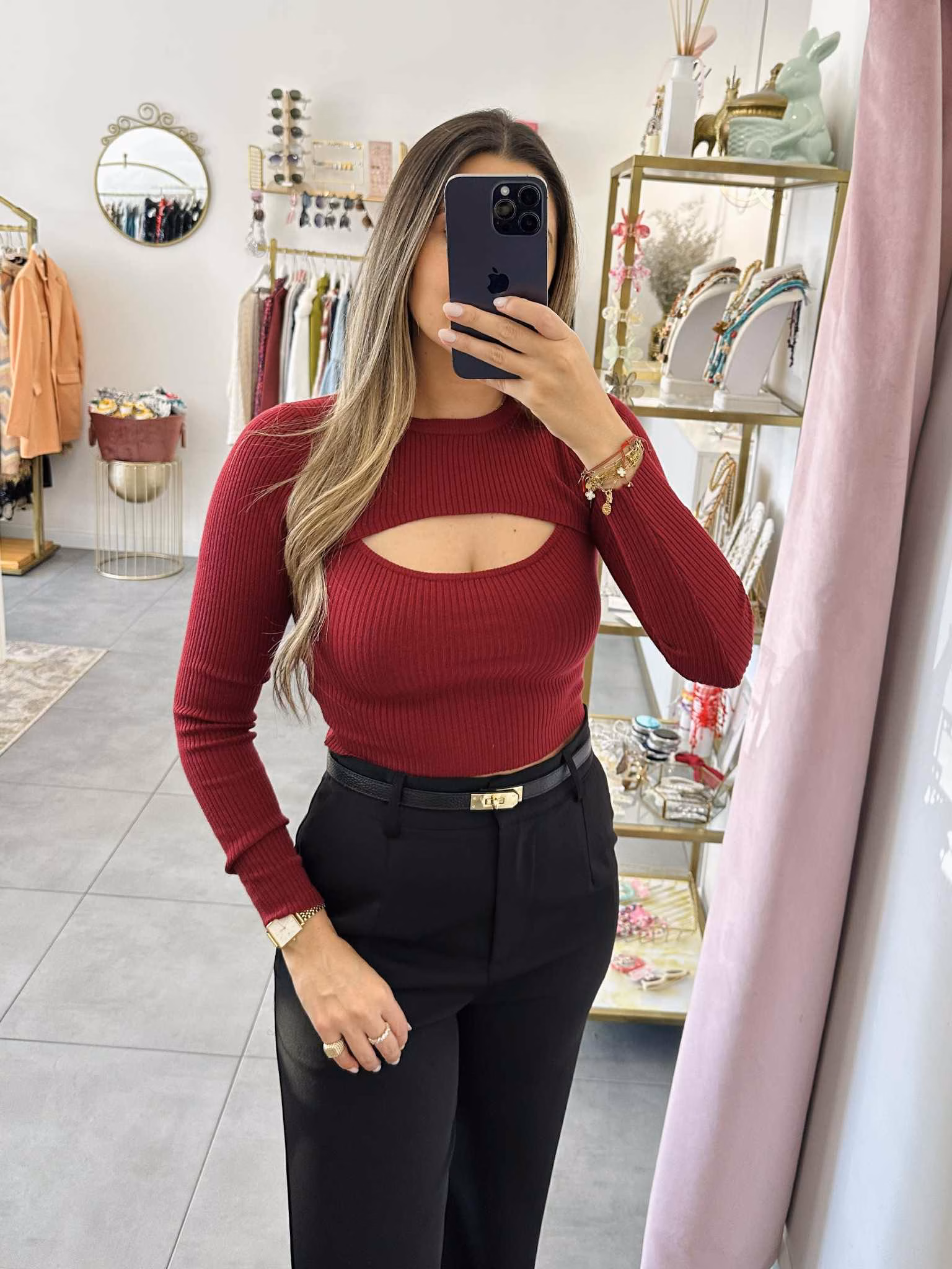 A modelo tem 1,73m e veste o tamanho M/L parte de cima e um 38/40 de parte de baixo.
