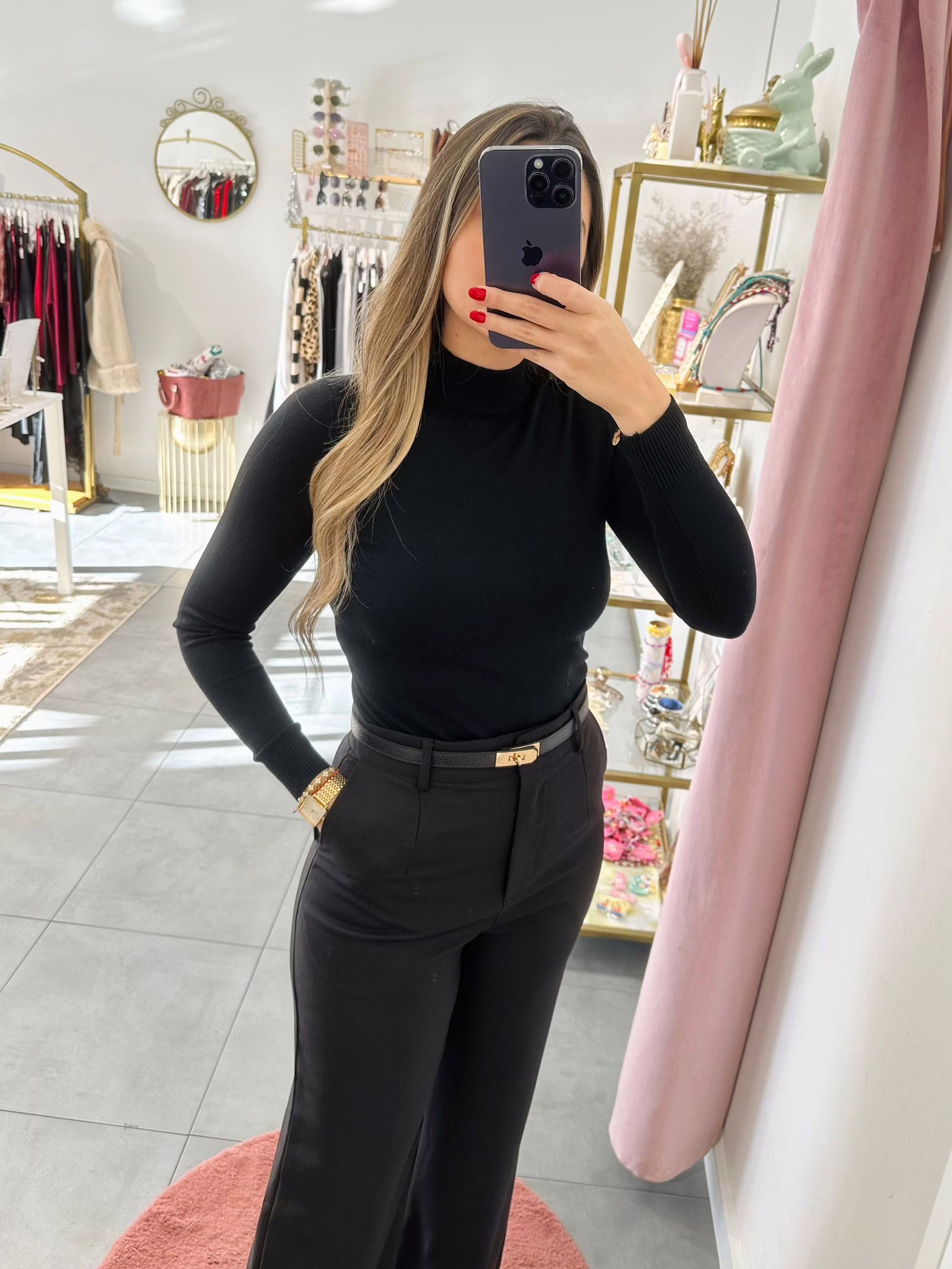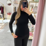 A modelo tem 1,73m e veste o tamanho M/L parte de cima e um 38/40 de parte de baixo.
