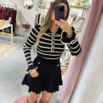 A modelo tem 1,73m e veste o tamanho M/L parte de cima e um 38/40 de parte de baixo.