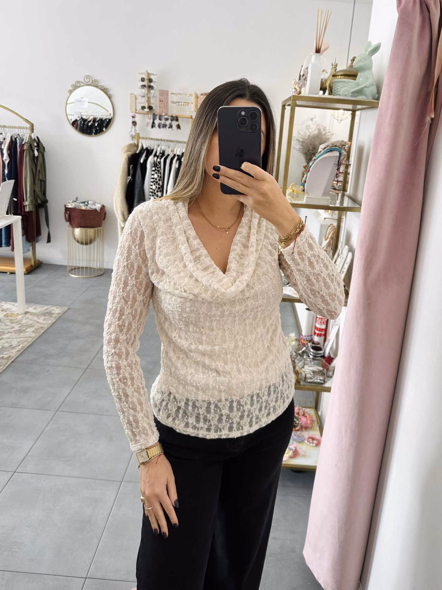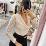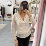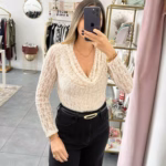 A modelo tem 1,73m e veste o tamanho M/L parte de cima e um 38/40 de parte de baixo.